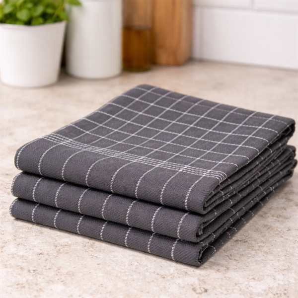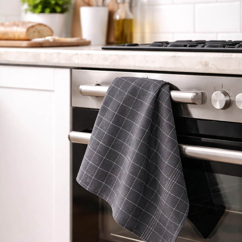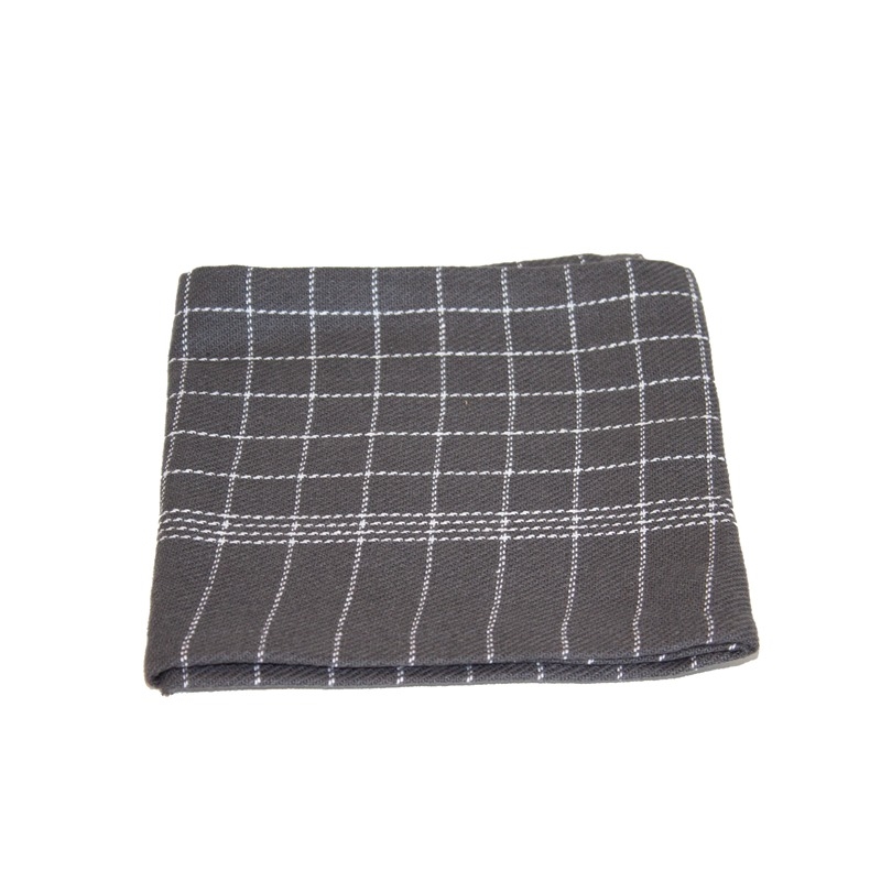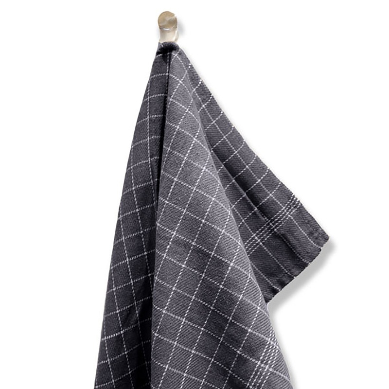 Moderne kjøkkenhåndkle i mørkegrå med hvite rutete detaljer