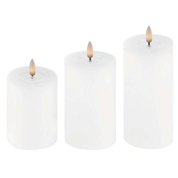 Dette settet består av tre elegante LED blokklys i hvit voks med resin-topp. Lysene har en diameter på 7,5 cm og høyder på 10, 12,5 og 15 cm, noe som gjør dem ideelle å plassere samlet i en dekorativ gruppe eller enkeltvis i hjemmet, på kontoret eller i butikken.