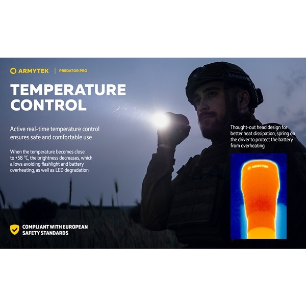 Armytek Predator Pro er enestående ikke bare for sin lysstyrke og fleksibilitet, men også for sin holdbarhet og pålitelighet. Den er laget av aluminium av flykvalitet og er designet for å tåle selv de mest krevende forhold. Med sine vanntette og støvtette egenskaper i henhold til IP68-standarden kan denne lampen trygt senkes ned til 25 meter, og den tåler en fallhøyde på 25 meter.
