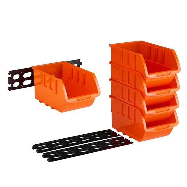 Skuffene er designet for å kunne stables, maksimere lagringsplassen og skape en mer organisert layout. To holdere for oppheng følger også med, slik at du enkelt kan montere skuffene på veggen og frigjøre bordplass. Dette gjør dem ideelle for bruk i verkstedet, garasjen, hobbyrommet eller andre steder hvor du trenger rask tilgang til småtingene dine.