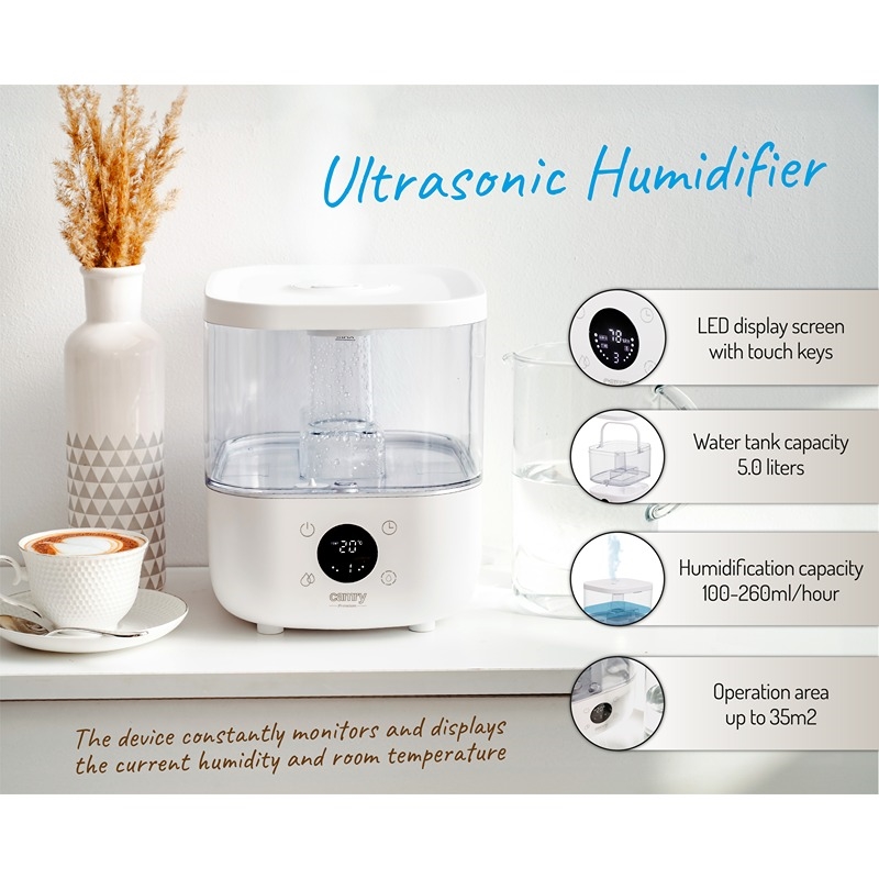 Skap et sunnere inneklima med Camry CR 7973B ultralyd luftfukter. Den store 5 liters vanntanken og en fuktehastighet på 100–260 ml/t gjør den ideell til rom opptil 35 m². Den innebygde hygrostaten måler luftfuktigheten og justerer automatisk, slik at du alltid oppnår optimal komfort.