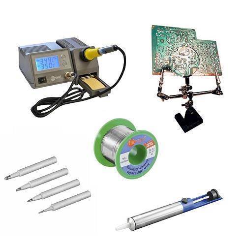 Komplett sett som inneholder alt du trenger for å starte opp. 100 G Loddetinn, Sett med 4 loddespisser, Proff tinnsuger og endelig den 3. hånd.
