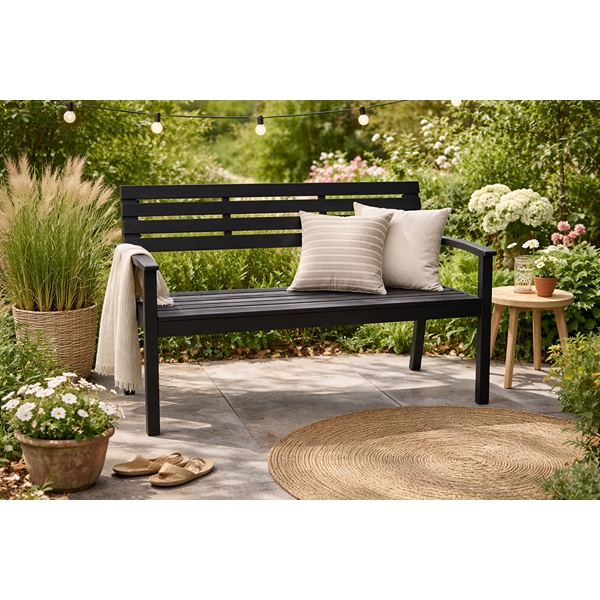 Denne elegante hagebenken med ryggstøtte og armlener kombinerer holdbarhet og moderne design. Rammen er laget av galvaniserte stålrør med sort pulverlakkering, som gir ekstra beskyttelse mot rust og vær. De sorte polywood-lamellene er vedlikeholdsfrie og værbestandige, noe som betyr at de tåler både sol og regn uten å kreve pleie. Benken måler 115 x 55 x 85 cm, har en sittehøyde på 40 cm, veier kun 14,5 kg, men kan bære opptil 220 kg. Perfekt for hagen, terrassen eller balkongen.