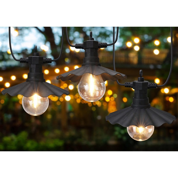 Gjør hagen, balkongen eller terrassen sjarmerende og nostalgisk med denne vakre partylyslenken med filament LED-pærer. Lyslenken består av 6 pærer (Ø 60 mm) med dekorative filamenter, hver med 11 LED-dioder, som skaper et varmt og hyggelig lys. Pærene er laget i slagfast plast, noe som gjør dem lette, holdbare og fri for risiko for å gå i stykker. De elegante bølgeformede lampeskjermene gir et unikt, vintageinspirert utseende ideelt til kaféstemning og festlige kvelder.
