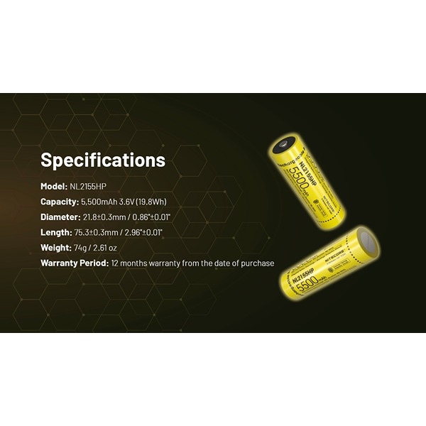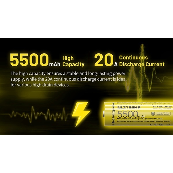 Nitecore NL2155HP er et høyytelses 21700 Li-ion batteri med en kapasitet på 5500mAh og en kontinuerlig utladningsstrøm på 20A, perfekt for kraftige lommelykter og annet høyeffektutstyr. Batteriet gir lang driftstid og stabil ytelse, samtidig som det er utstyrt med avanserte sikkerhetsfunksjoner. Batteriet er IPX6-klassifisert og veier kun 74 g