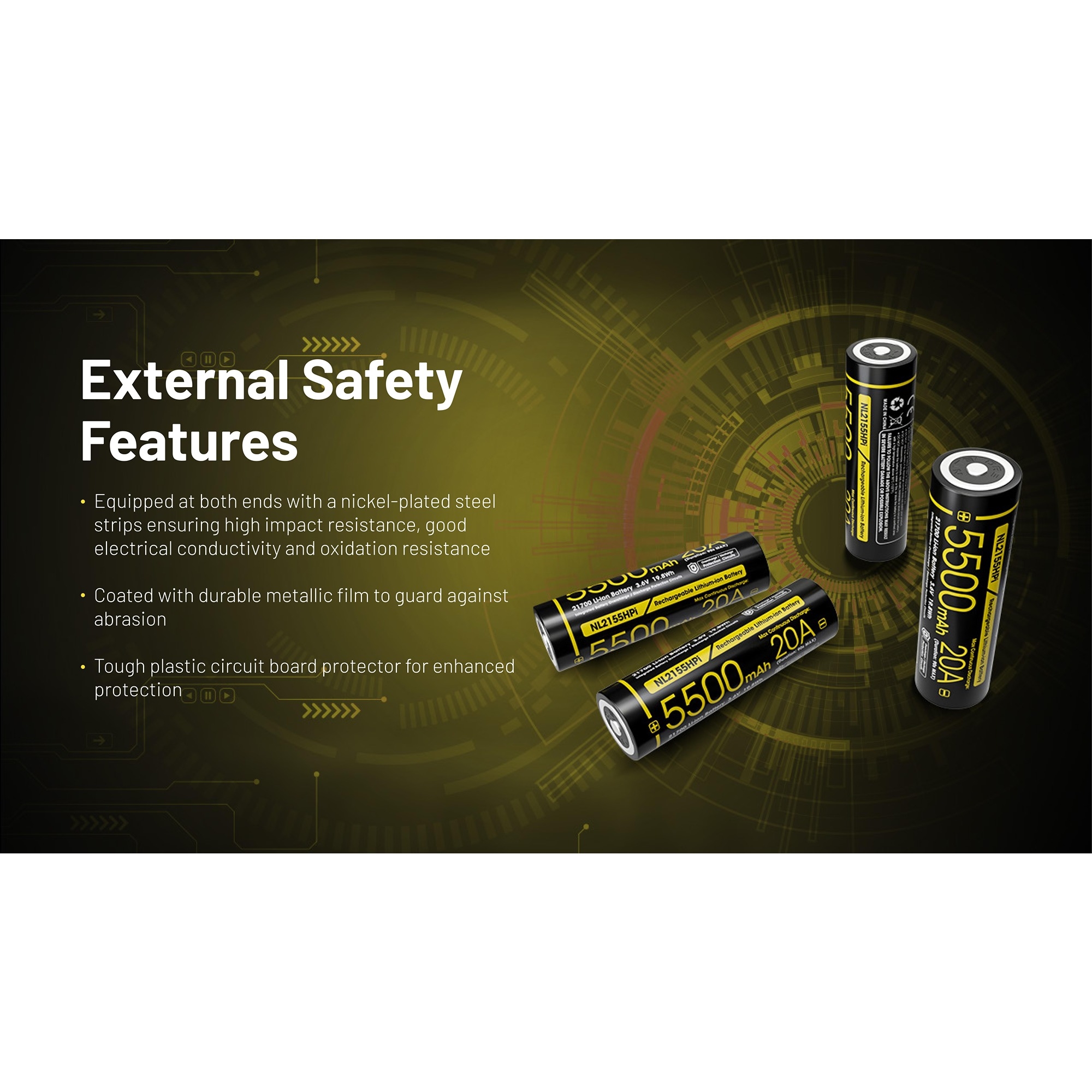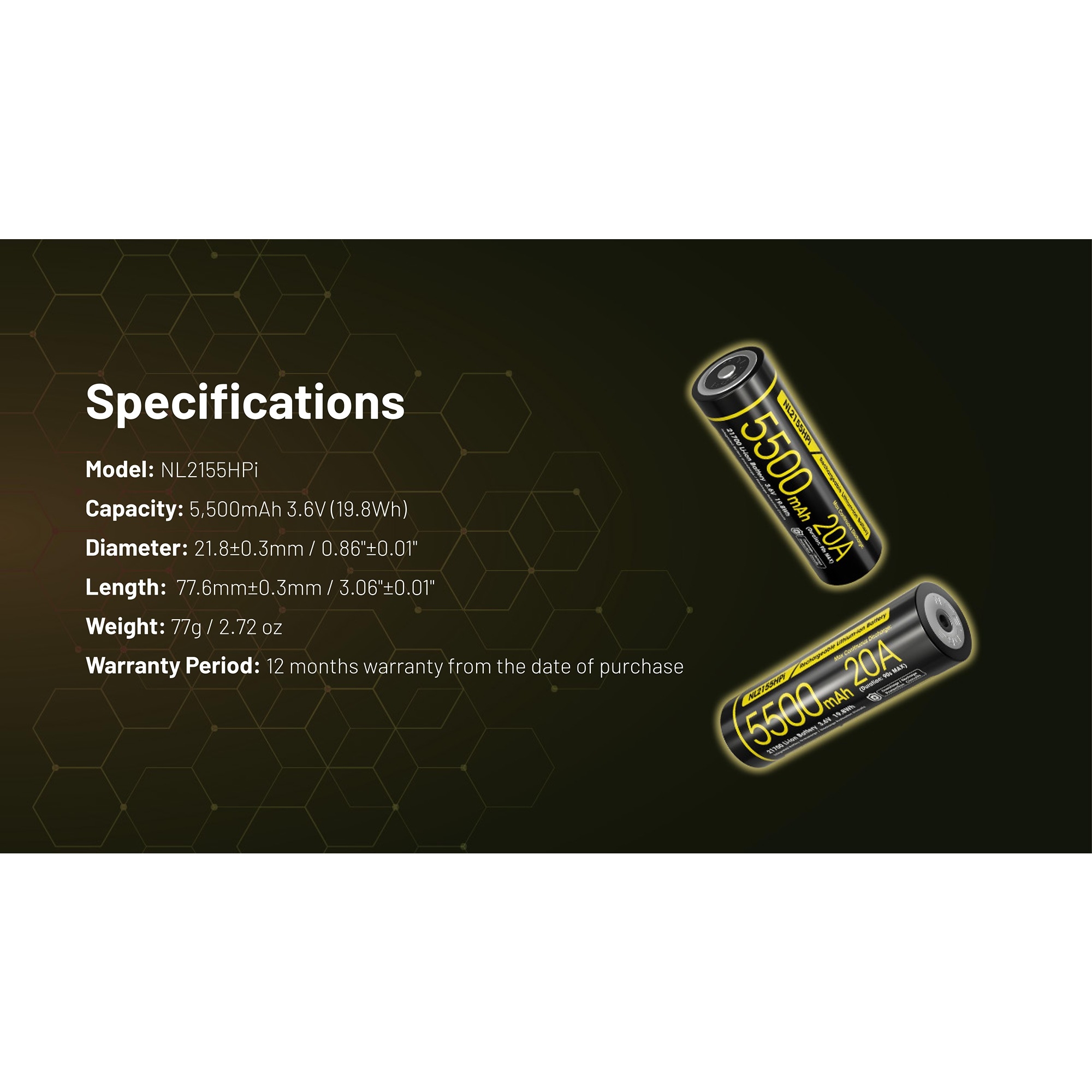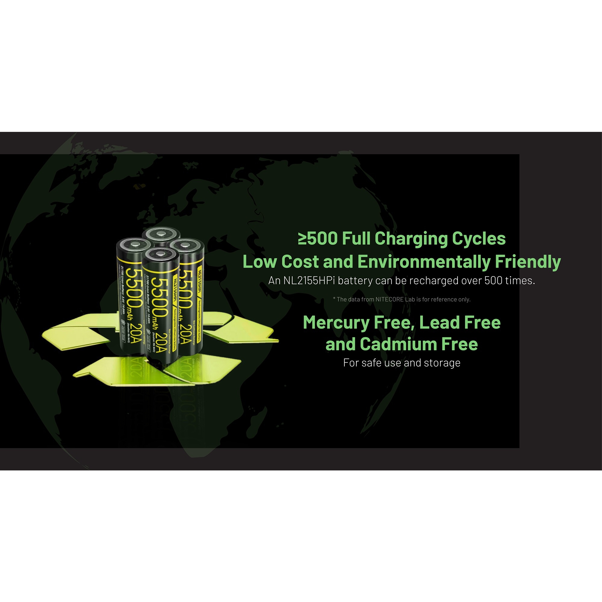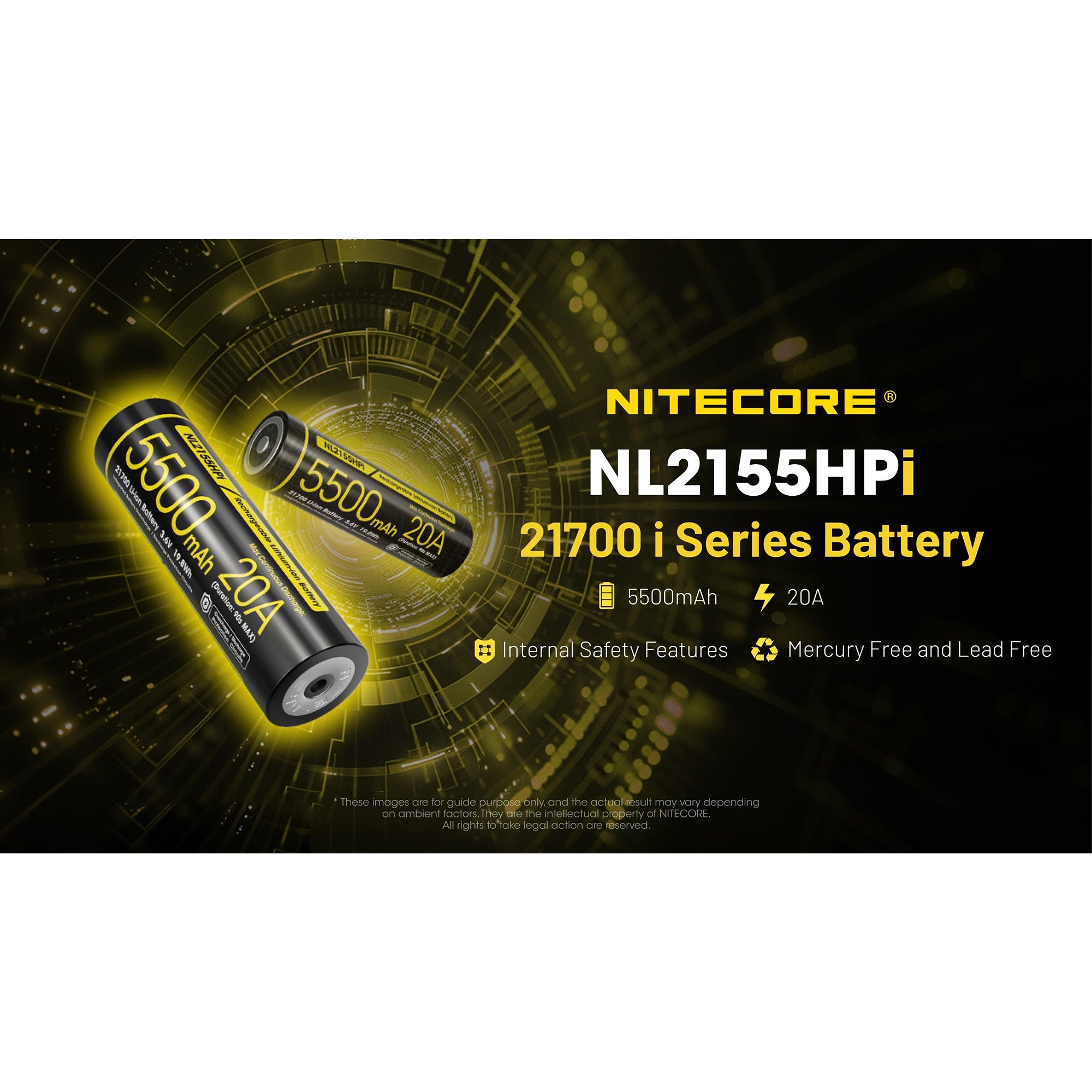 Nitecore NL2155HPi er et oppladbart li-ion batteri utviklet til Nitecores i Series og til brukere som trenger stabil strøm, høy kapasitet og pålitelig ytelse. Med 5.500 mAh, 3,6 V og en kontinuerlig utladningsstrøm på 20A er det et Nitecore batteri som er laget for kompatible lygter med høyt strømforbruk.