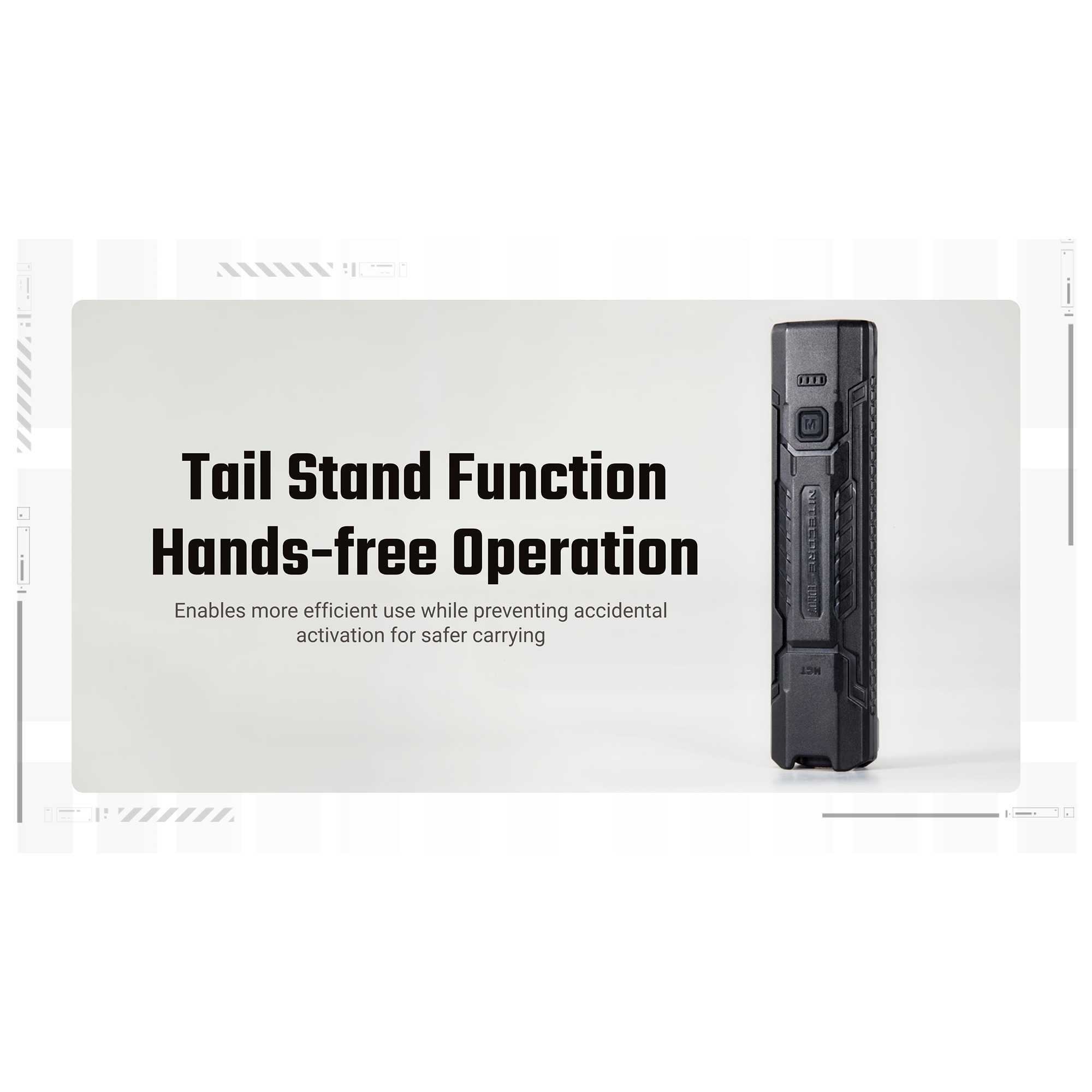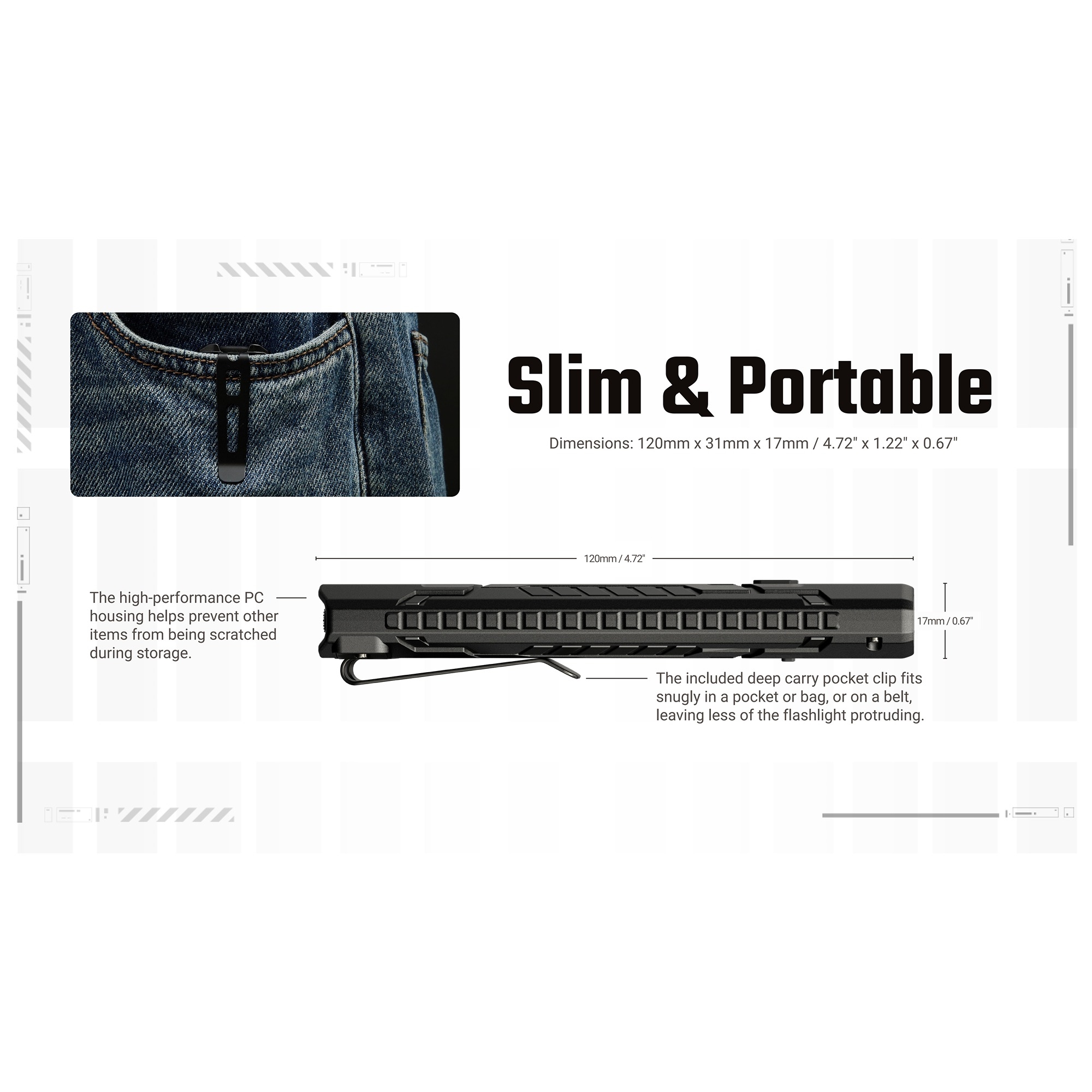 Nitecore-lommelykten med flat bakende gjør at den kan stå oppreist og brukes håndfritt. Det teksturerte grepet, det lette huset i high-performance PC og klipsen i rustfritt stål støtter en praktisk og realistisk bruk både i arbeid og fritid. Med opptil 360 timers driftstid, fem lysnivåer samt STROBE og SOS er den klar når du trenger en kompakt, men seriøs lyskilde.