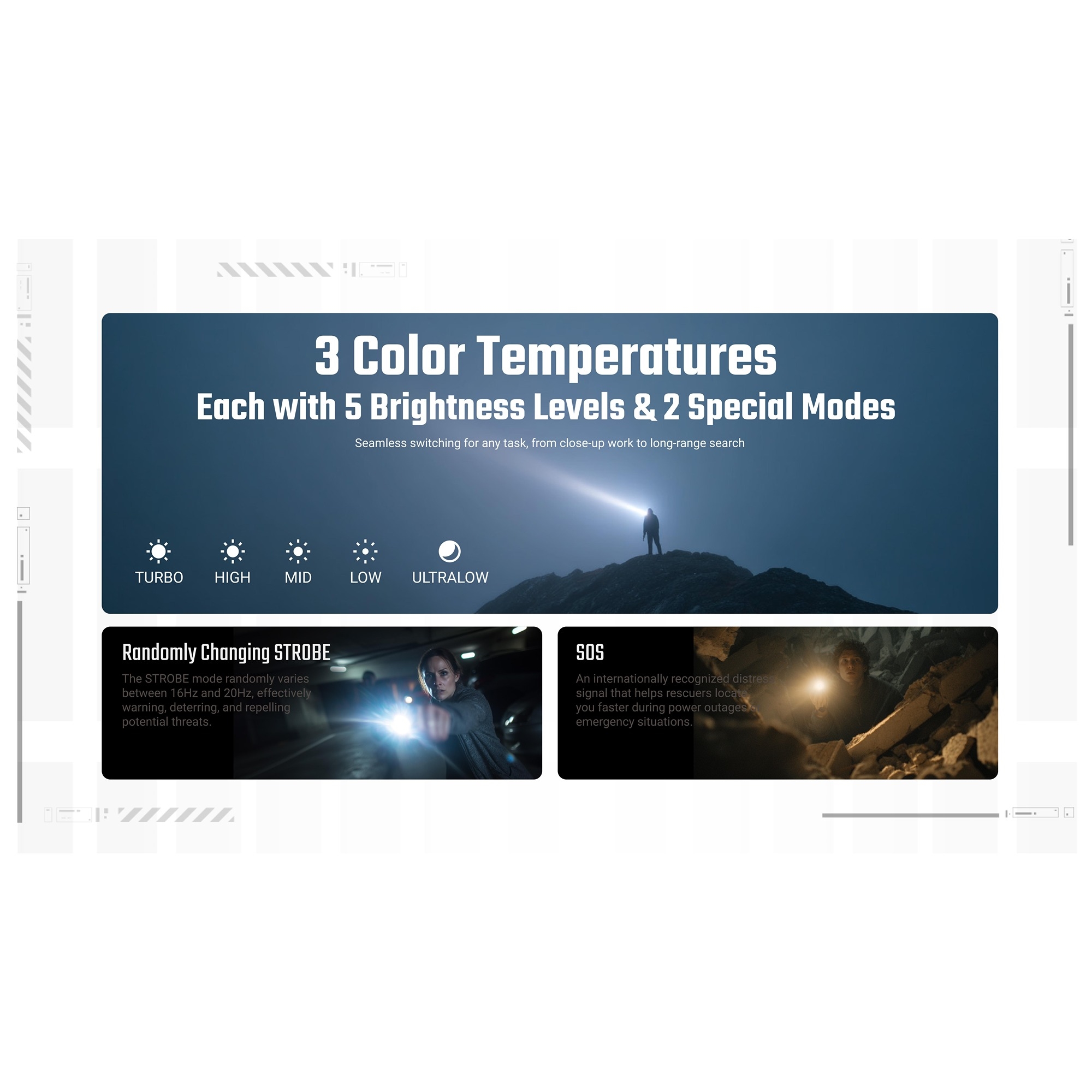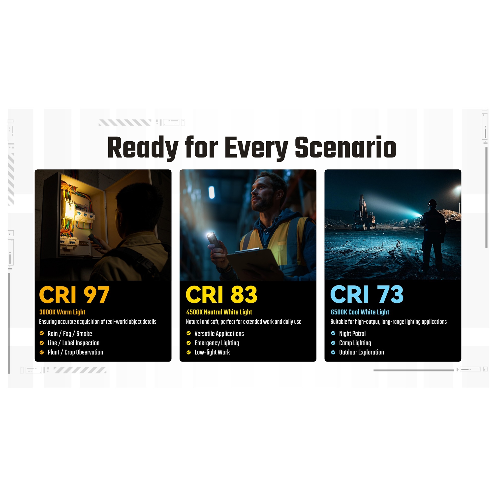Det spesielle med Nitecore EDC07 er lysets allsidighet. Lykten har tre fargetemperaturer: varm 3000K, nøytral 4500K og kjølig 6500K. Det betyr at du kan velge et mer behagelig og detaljert lys til inspeksjon, lesing og nært arbeid eller et skarpere lys til utendørs bruk og oversikt. Med CRI opptil 97 gjengir den farger merkbart mer naturlig enn mange tradisjonelle LED-lykter. Den er derfor godt egnet til håndverk, teknisk arbeid, lager, bil, camping og som en pålitelig hverdagslykt.