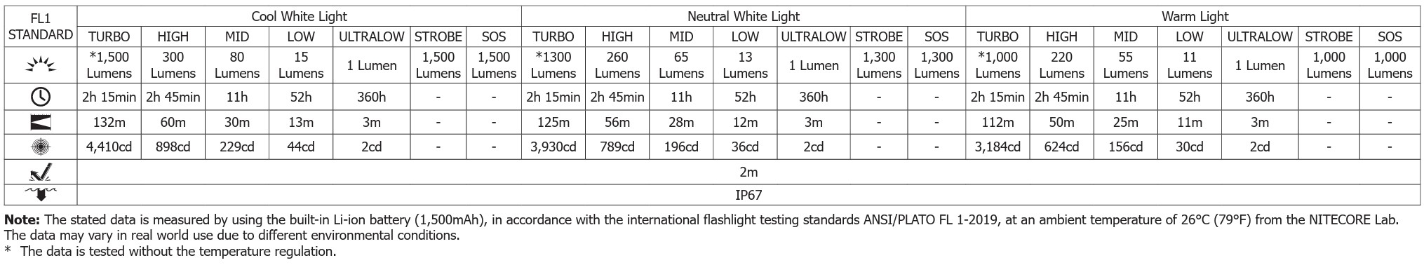 Driftstid ved høyeste lysstyrke (Kald Hvit/1500 lumen): 2 timer og 15 min