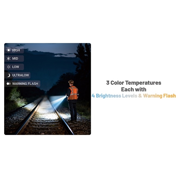 Varmt hvitt lys (3000K) - High: 1050 lumen | Mid: 150 lumen | Low: 32 lumen | Ultralow: 1 lumen