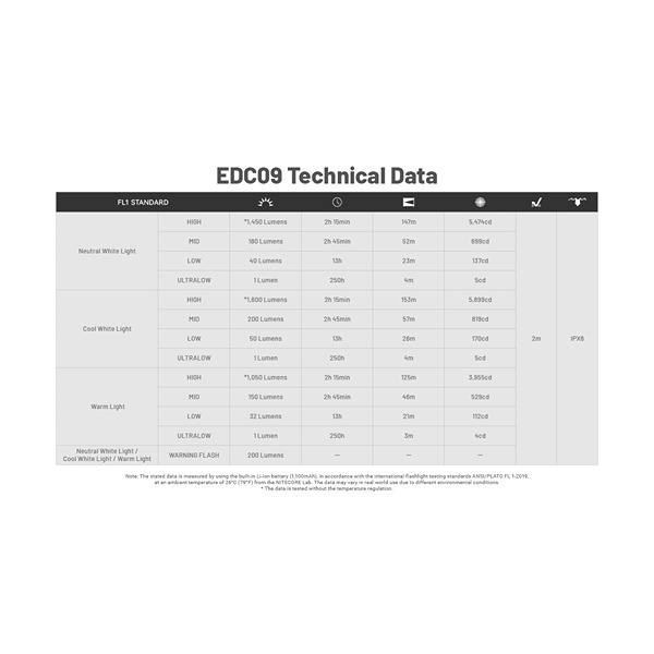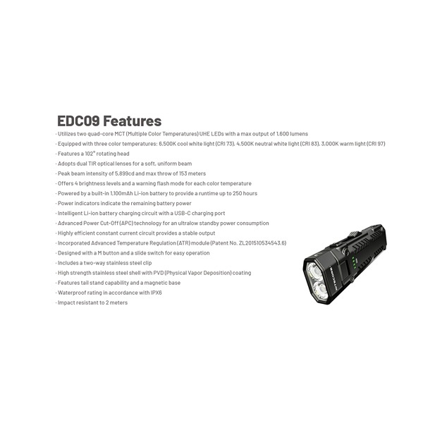 Nitecore EDC09 er den ultimate lommelykten for deg som ønsker kraft, presisjon og allsidighet i ett kompakt verktøy. Med opptil 1.600 lumens og en rekkevidde på 153 meter leverer den imponerende lysstyrke til enhver oppgave – fra arbeidsbruk til utendørs og nødsituasjoner. Den unike MCT-teknologien gir tre fargetemperaturer (CRI), slik at du alltid kan velge det lyset som passer best til miljøet. Les mer om den smarte MCT-teknologien her. Her kan velges mellom fire forskjellige lysstyrker per fargetemperatur: Nøytralt hvitt lys 4500K, kaldt hvitt lys 6500K og varmt hvitt lys 3000K. I tillegg kommer en advarsels-/flashfunksjon på 200 lumens, hvor den blinker med en blanding av alle tre CRI. Lykten er utstyrt med TIR-linser, som sikrer en jevn, myk og effektiv lysstråle.