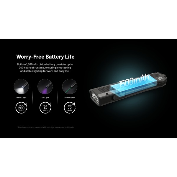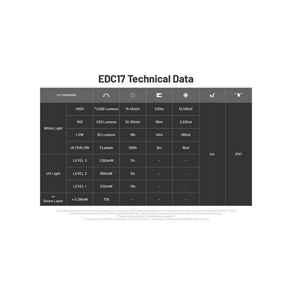 Nitecore EDC17 er en multifunksjonell lykt med UV-lys, hvitt lys og grønn laser, designet for deg som krever allsidighet og ytelse i ett kompakt verktøy. Det hvite lyset leverer opptil 1500 lumen og en rekkevidde på 230 meter, som gir imponerende belysning til både profesjonelle oppgaver og friluftsaktiviteter. Det kraftige UV-lyset har en bølgelengde på 365–375 nm, som gjør det ideelt for inspeksjon, identifikasjon og som ravlykt. Den grønne laseren er EU Klasse 1-sertifisert og gir presis sikting og merking – og kan til og med brukes samtidig med det hvite lyset, slik at du kan peke og orientere deg i mørke omgivelser.