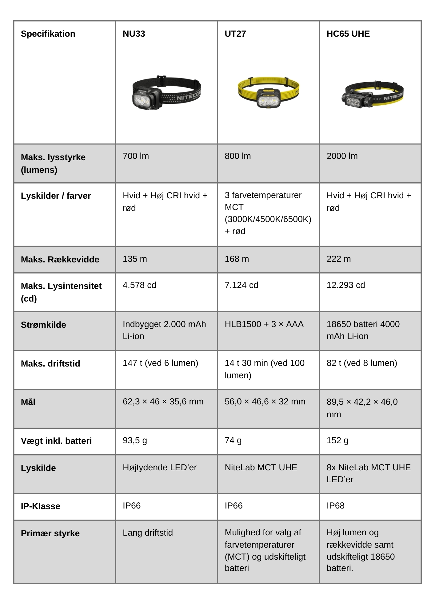 Er du usikker på forskjellene mellom modellene, kan det være lurt å ta en titt på sammenligningsskjemaet vårt nedenfor, der du raskt kan sammenligne lumen, rekkevidde, batteritype, vekt og IP-klassifisering. Det gir en tydelig oversikt over hvilken modell som passer best til din type tur.