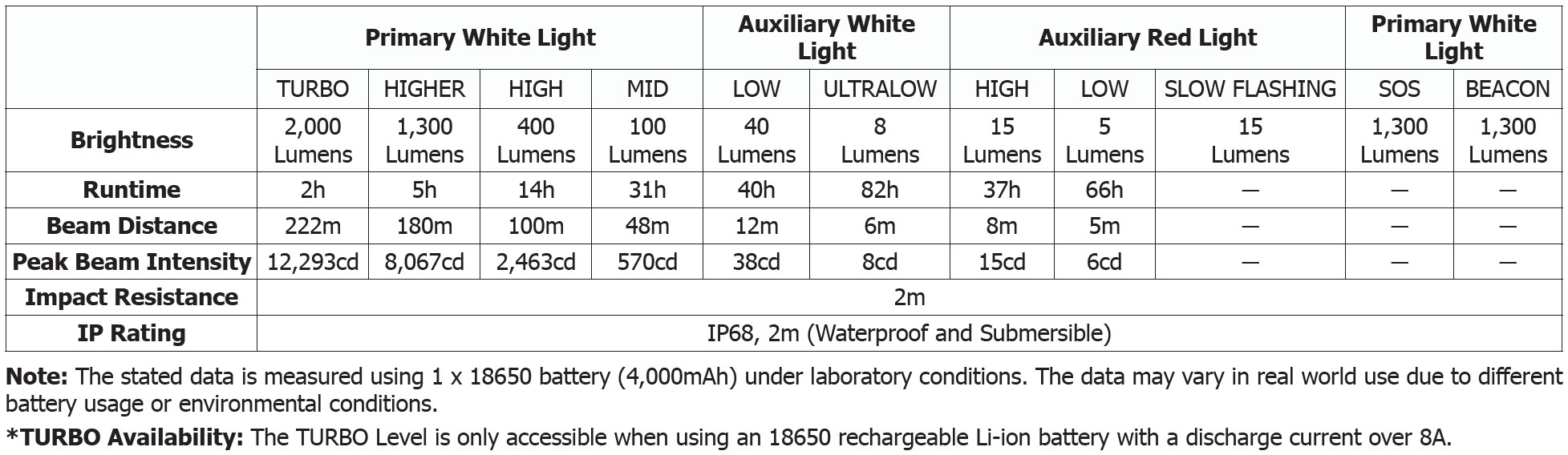Driftstid ved høyeste lysstyrke (Hvit/2000 lumen) : 2 timer