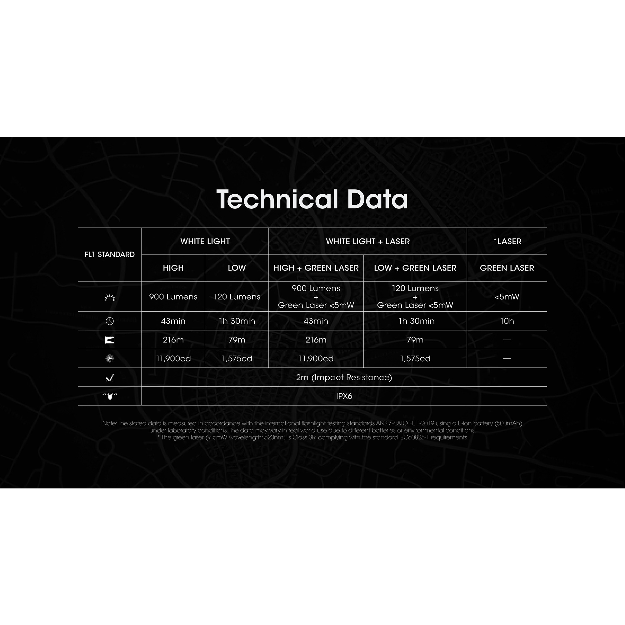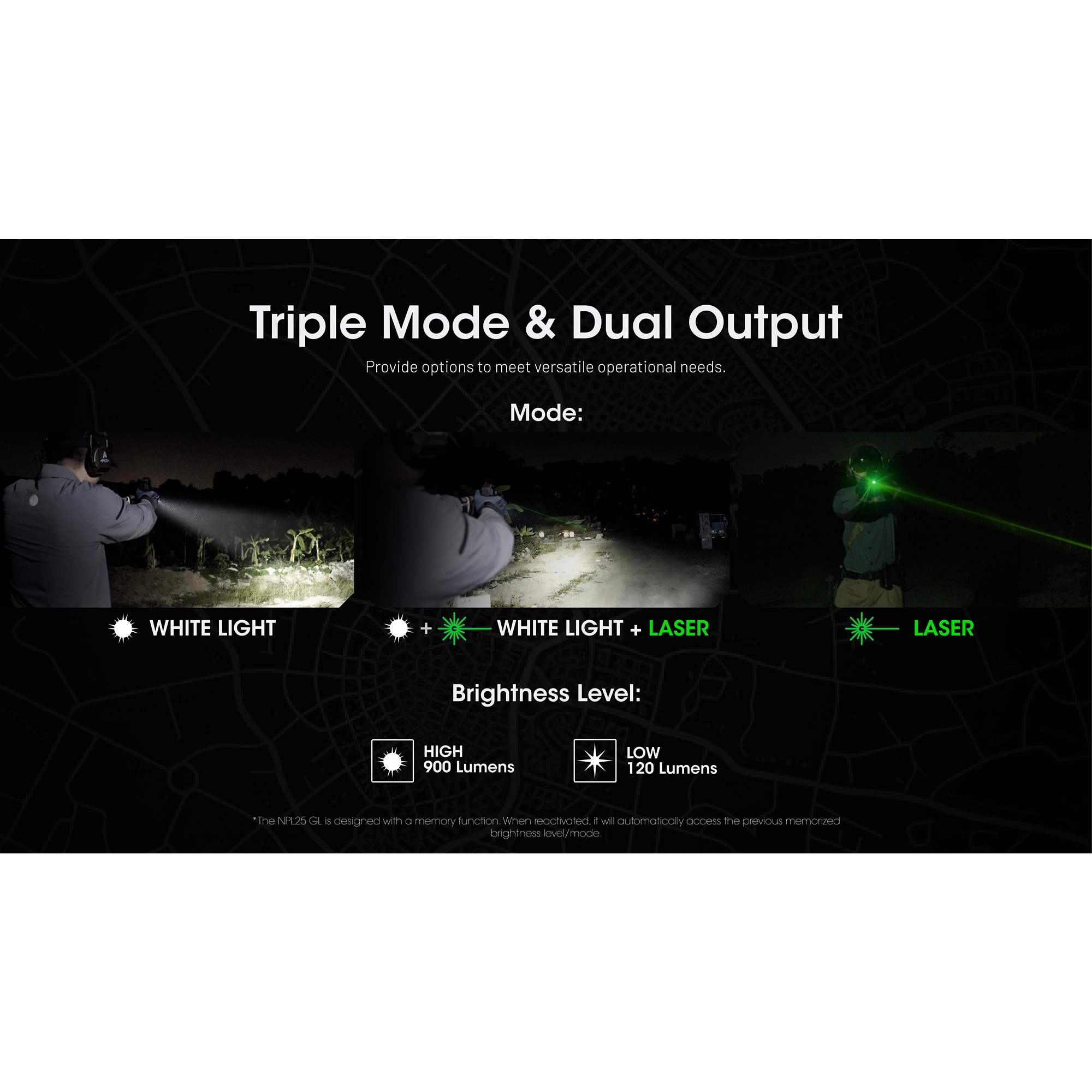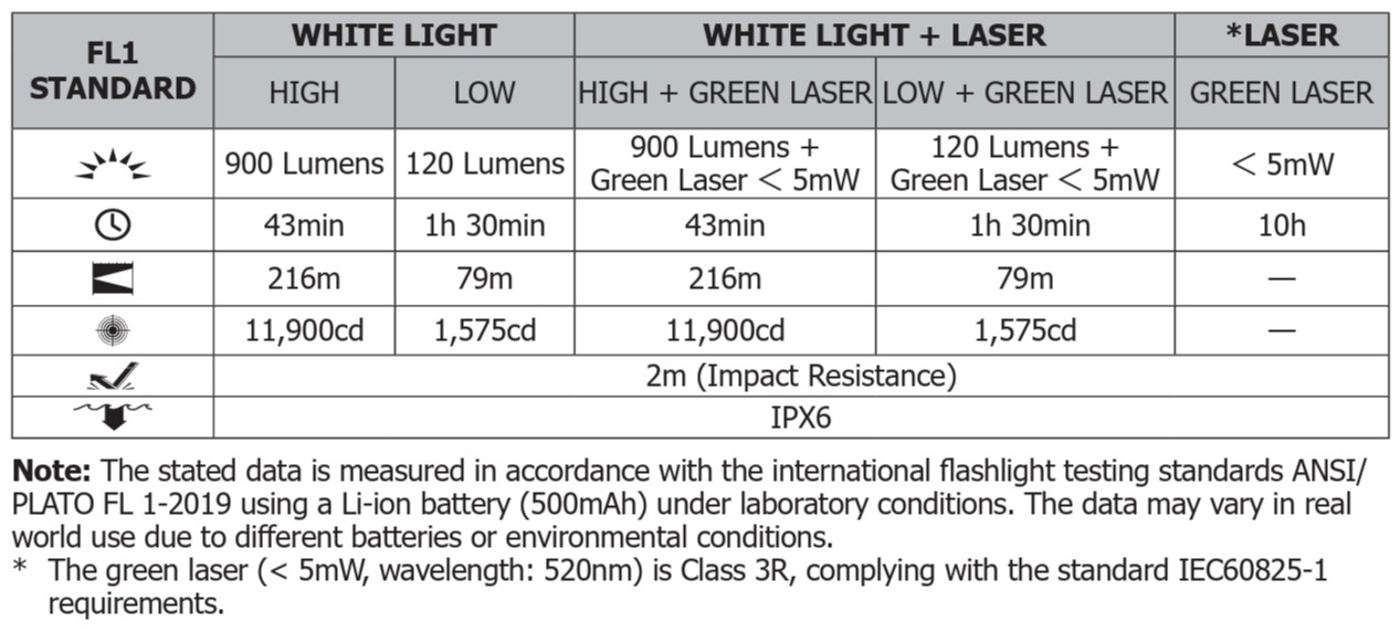 • Kombinerer 900 lumen hvitt lys med integrert grønn laser i samme enhet.