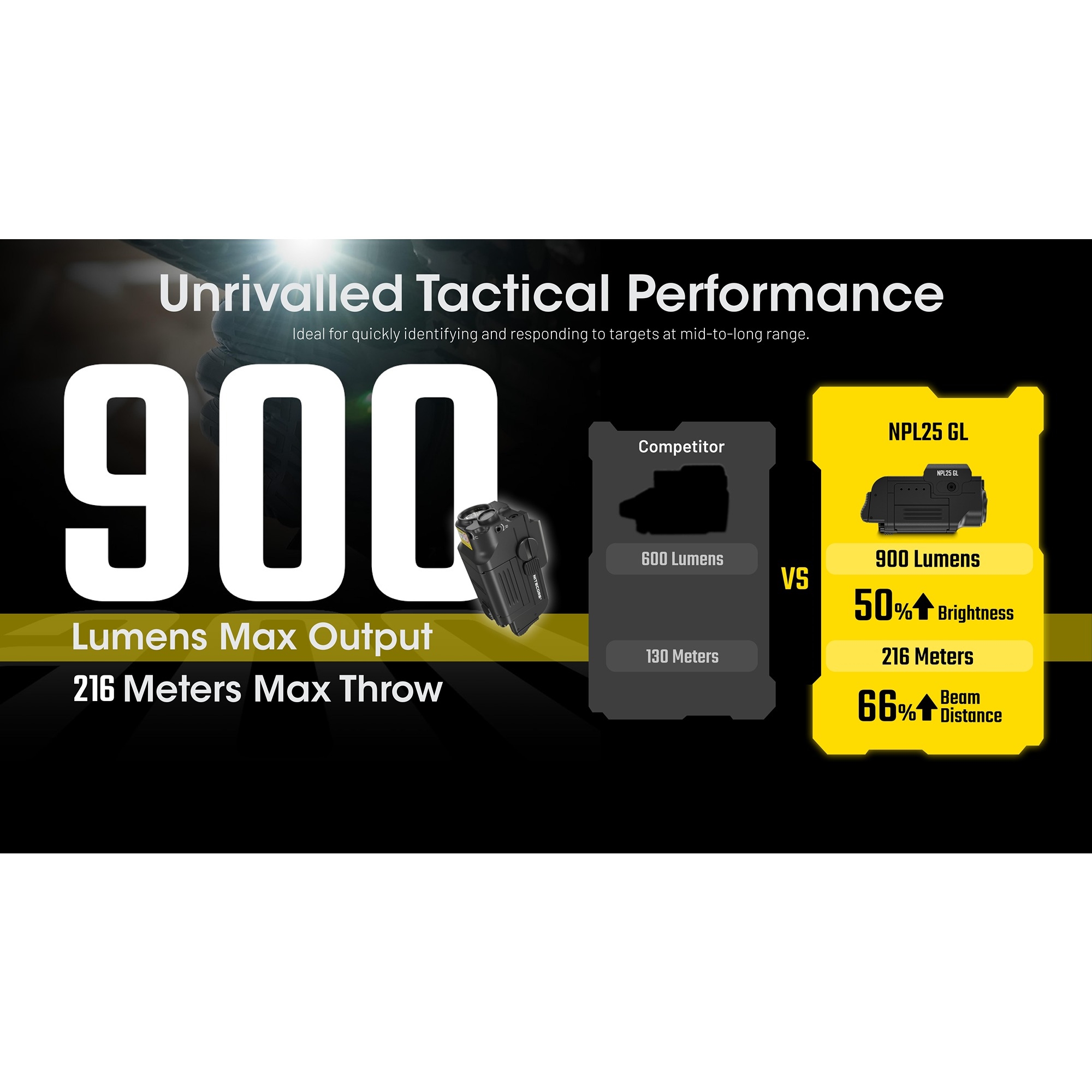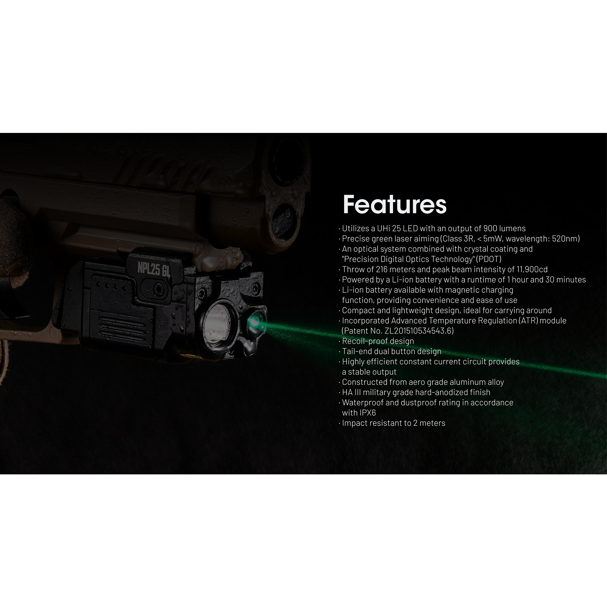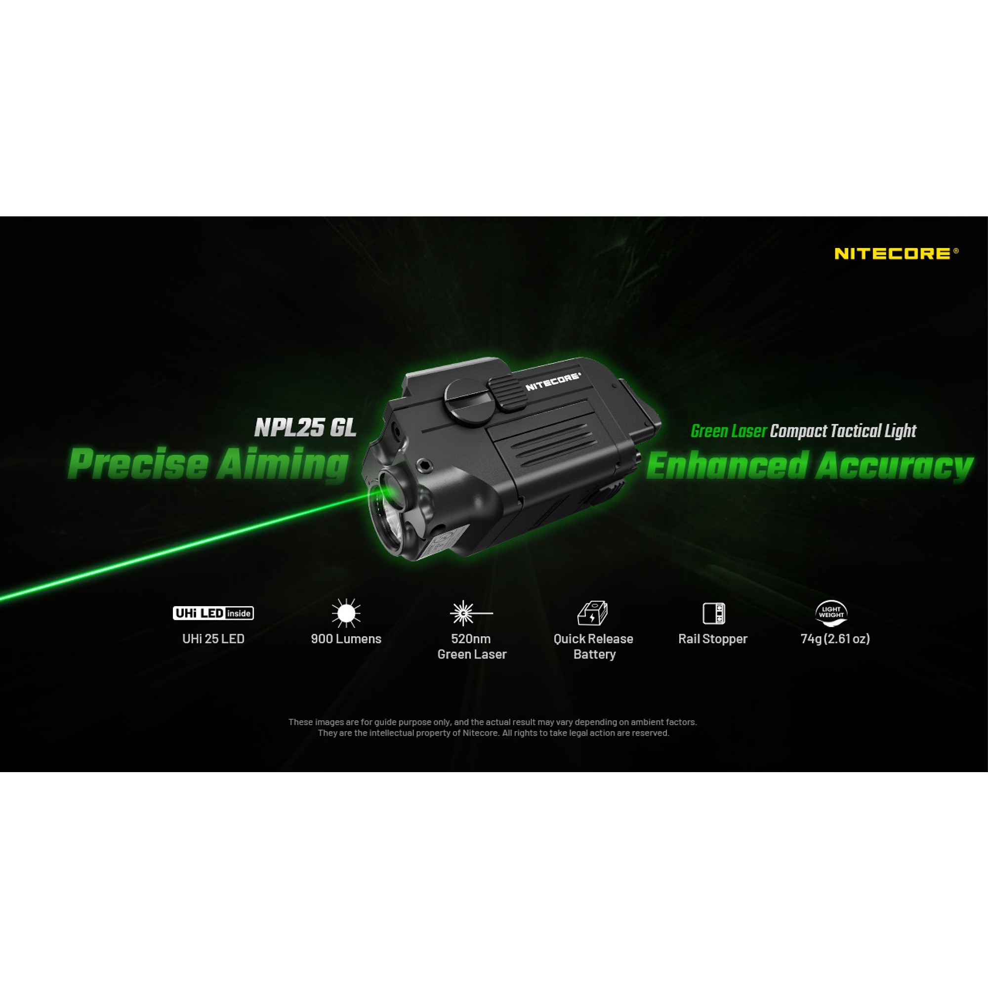 Produkt:  Nitecore NPL25 GL Oppladbar Våpenlykt med Laser 900 lumen