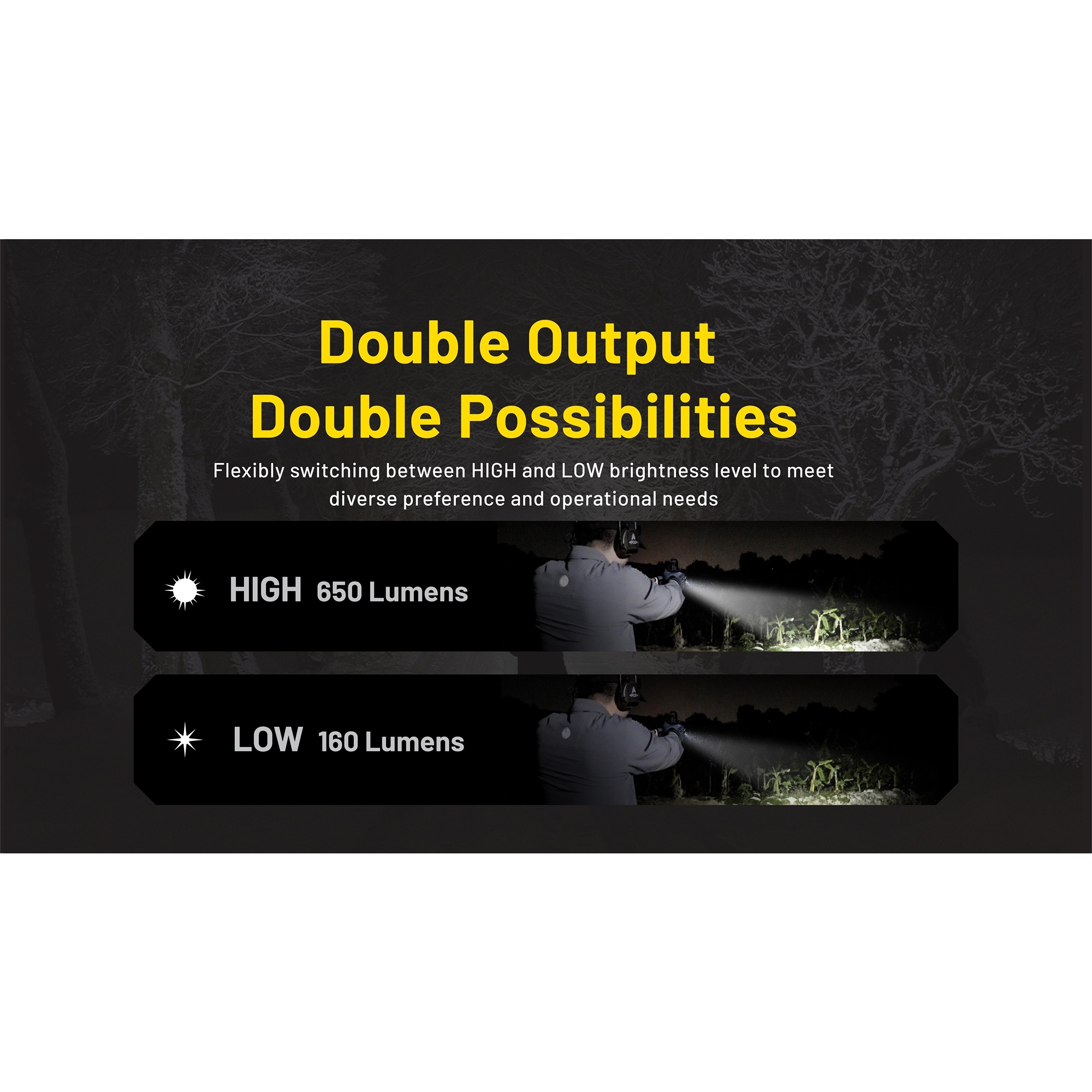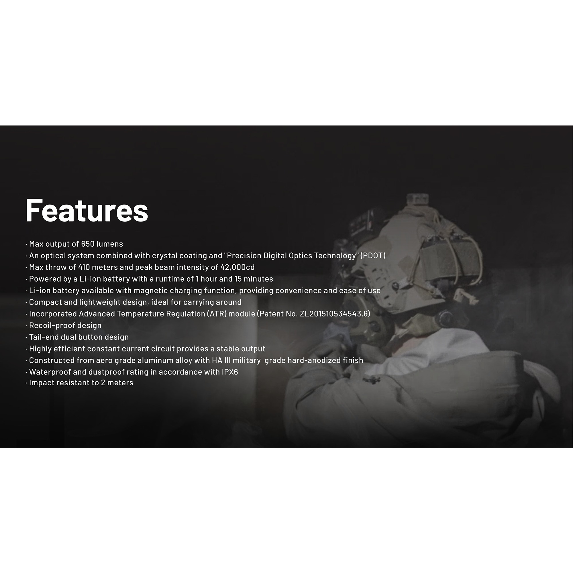 • 650 lumen i kombinasjon med 410 meters rekkevidde gir et skarpt og fokusert lys