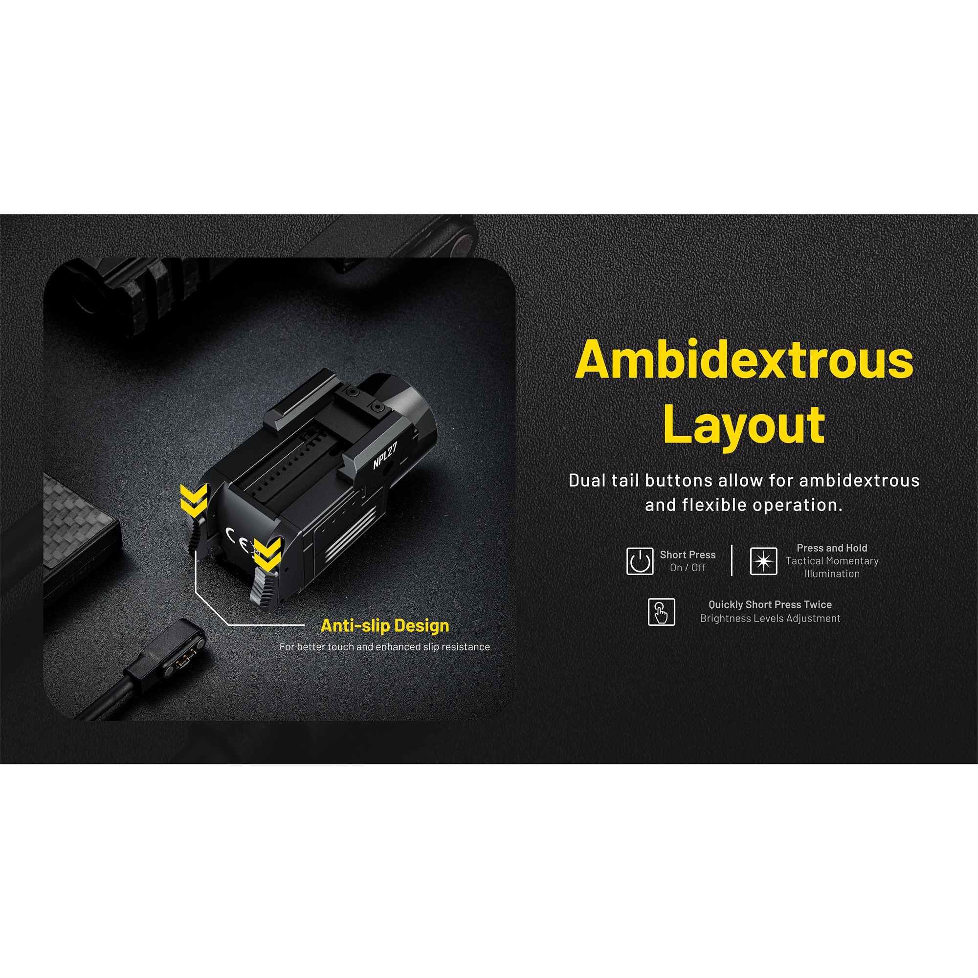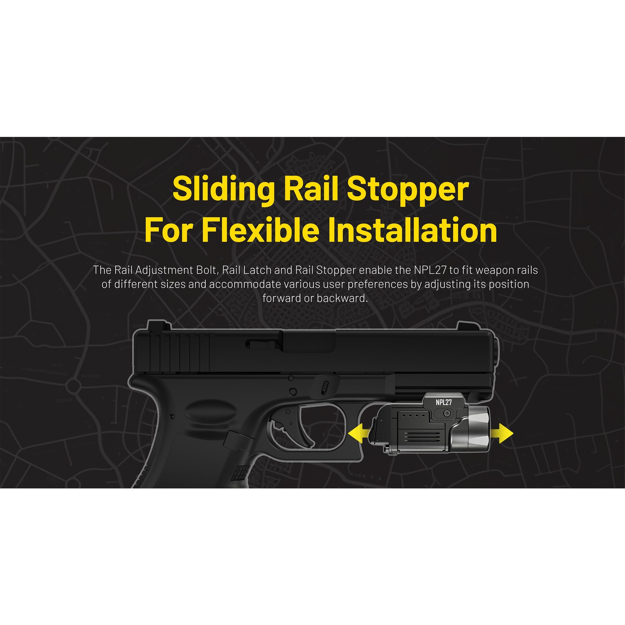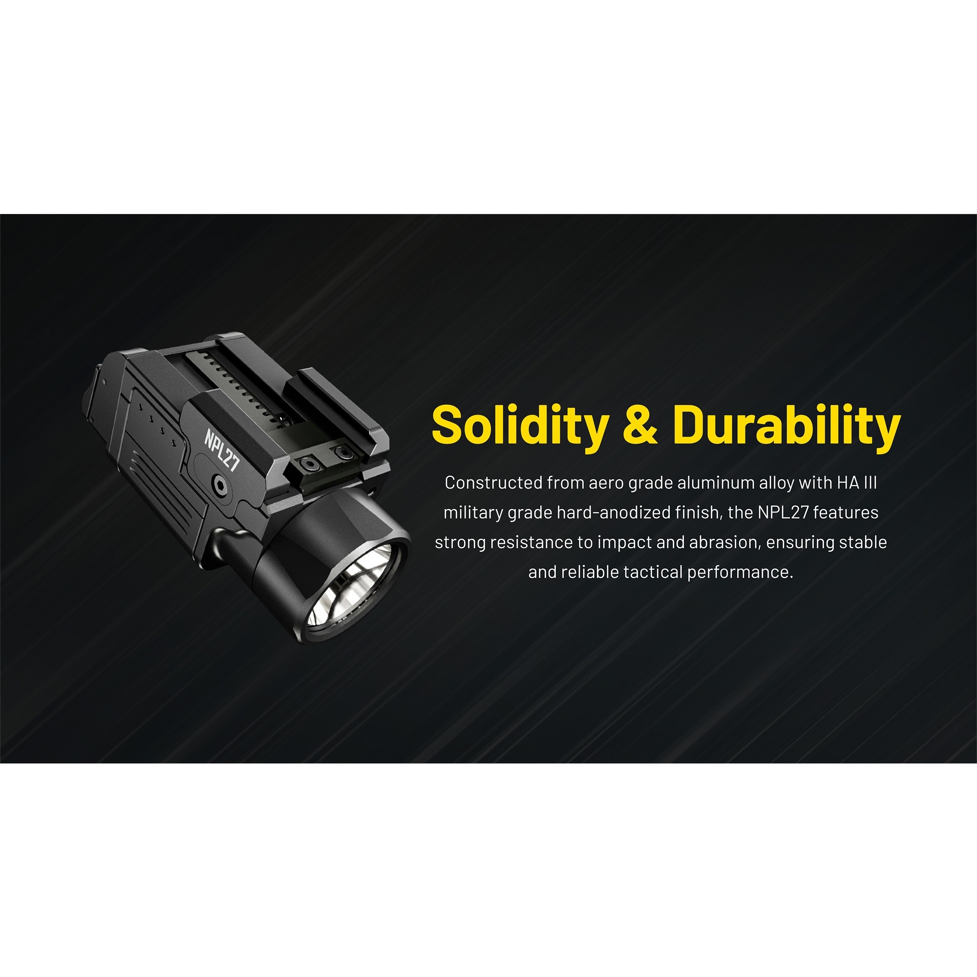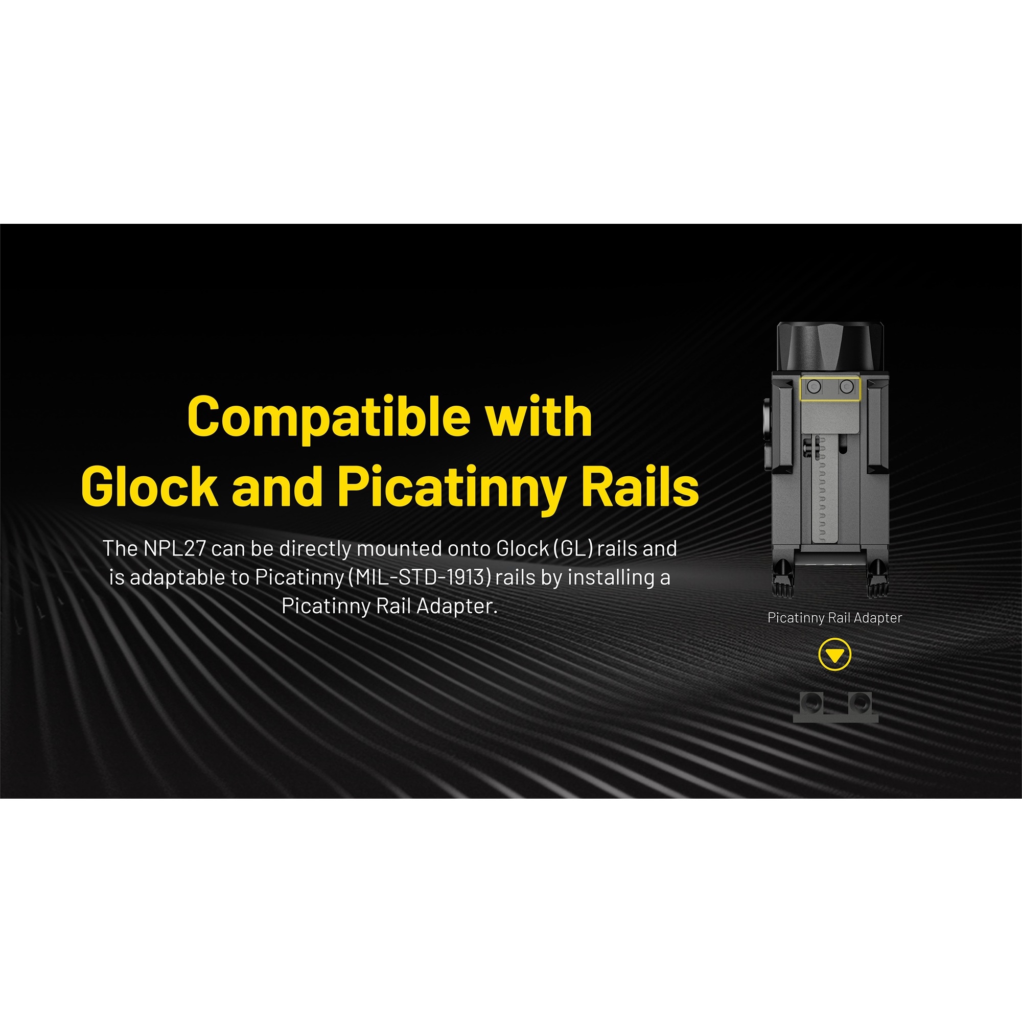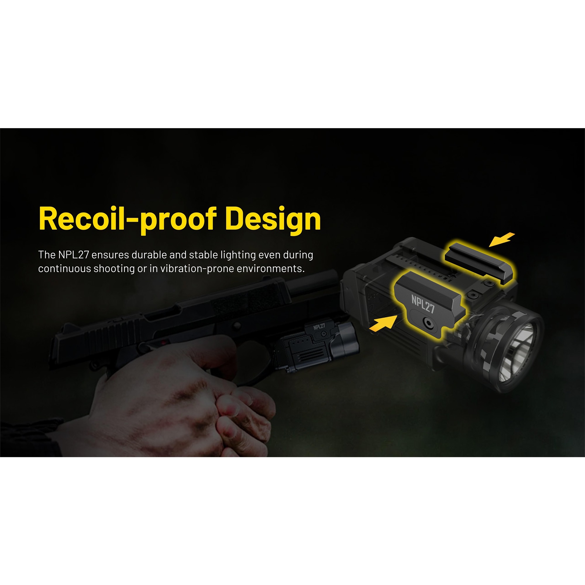 NPL27 er utviklet i et lavprofil-design, slik at lykten sitter tett og diskret. De doble bakknappene gjør den enkel å betjene fra begge sider, noe som gir en rask og enkel aktivering. Lykten kan monteres direkte på Glock-skinner og kan via den medfølgende Picatinny-adapteren også brukes på Picatinny-skinner. Det gir en fleksibel løsning som passer til flere ulike plattformer.