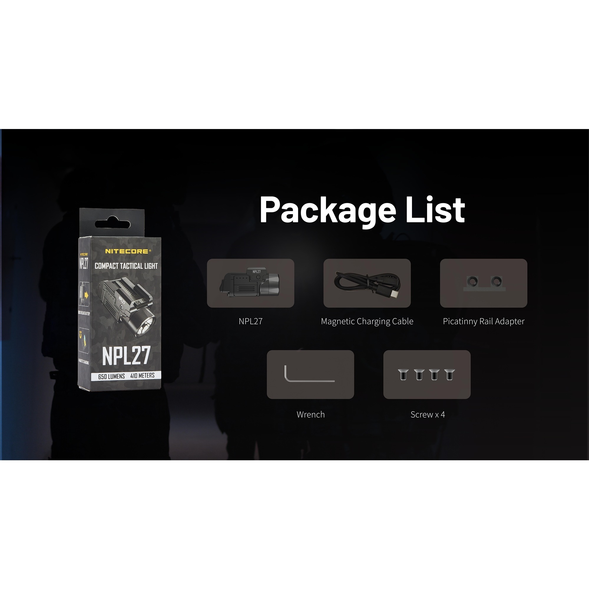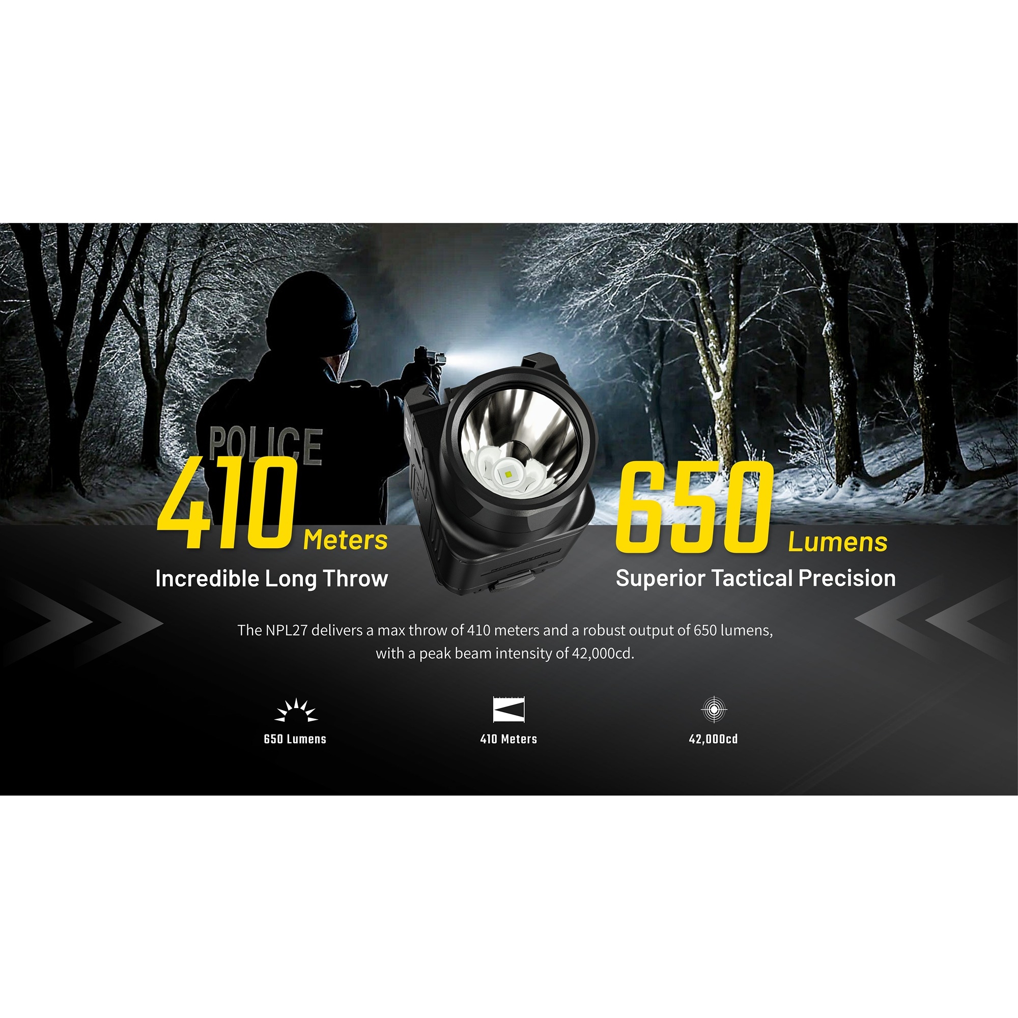 Nitecore NPL27 er en kompakt Nitecore våpenlykt for deg som ønsker et slankt format kombinert med et kraftig lys. Med opptil 650 lumen og en rekkevidde på 410 meter får du en modell som tar svært liten plass, men som fortsatt leverer et fokusert lysbilde med god rekkevidde. Den lave vekten på 73 gram inkludert batteri gjør samtidig NPL27 til et opplagt valg hvis du ønsker en lettere og mer balansert løsning.