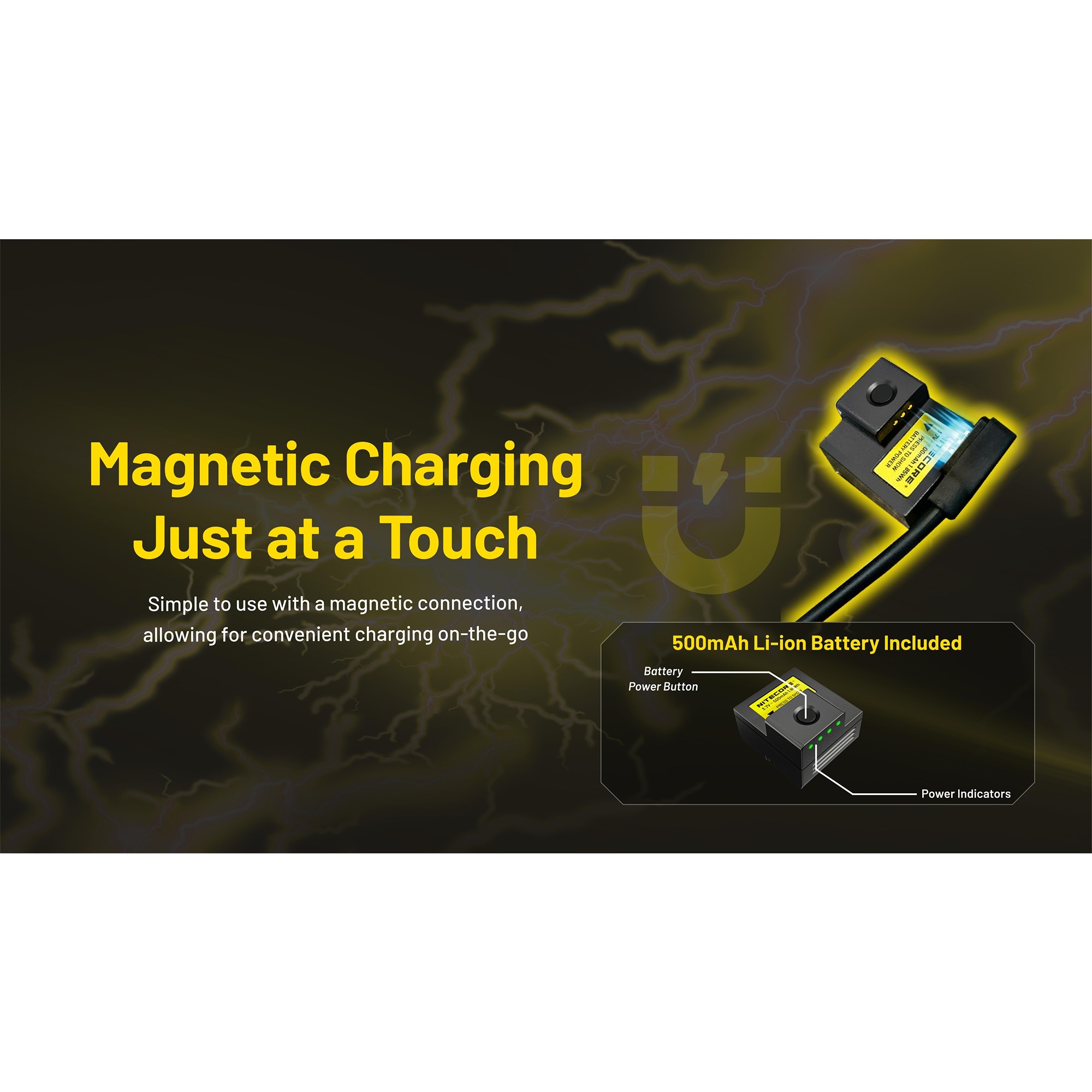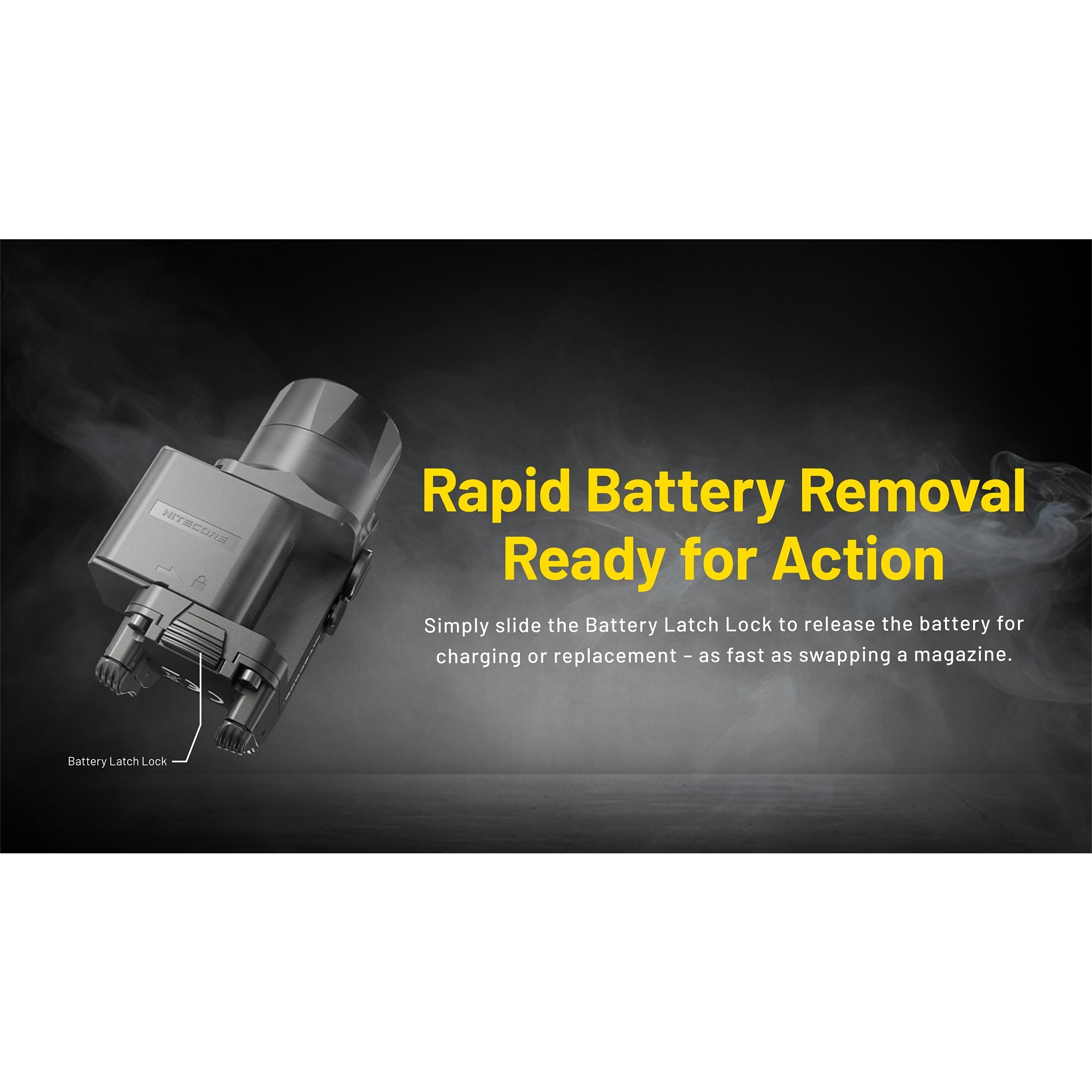 Den oppladbare våpenlykten bruker et avtakbart 500 mAh Li-ion-batteri, som lades med den medfølgende magnetiske ladekabelen via en separat USB-C-strømkilde. Det gjør ladingen enkel, og hvis du vil være ekstra godt forberedt, kan det kjøpes ekstra PLB500-batterier. På den måten er det mulig alltid å ha et ekstra batteri med, slik at lykten raskt kan være klar igjen.