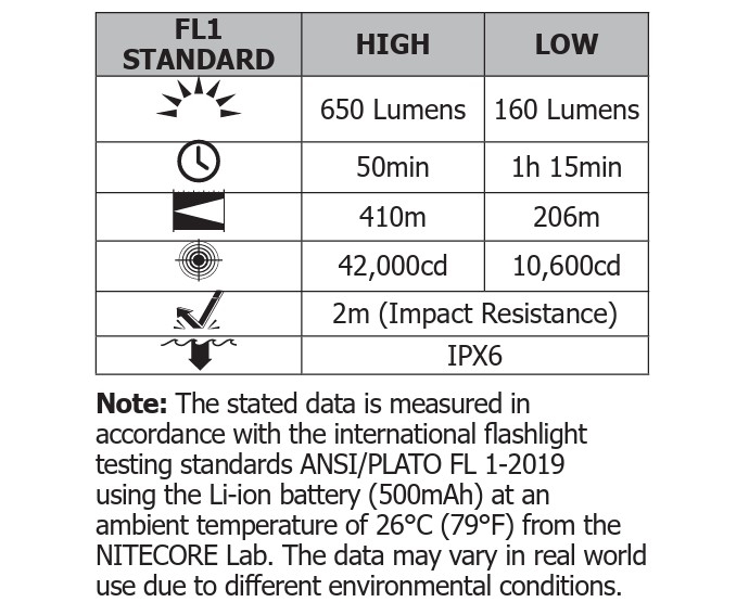 Driftstid ved høyeste lysstyrke (Hvit/650 lumen) : 50 min