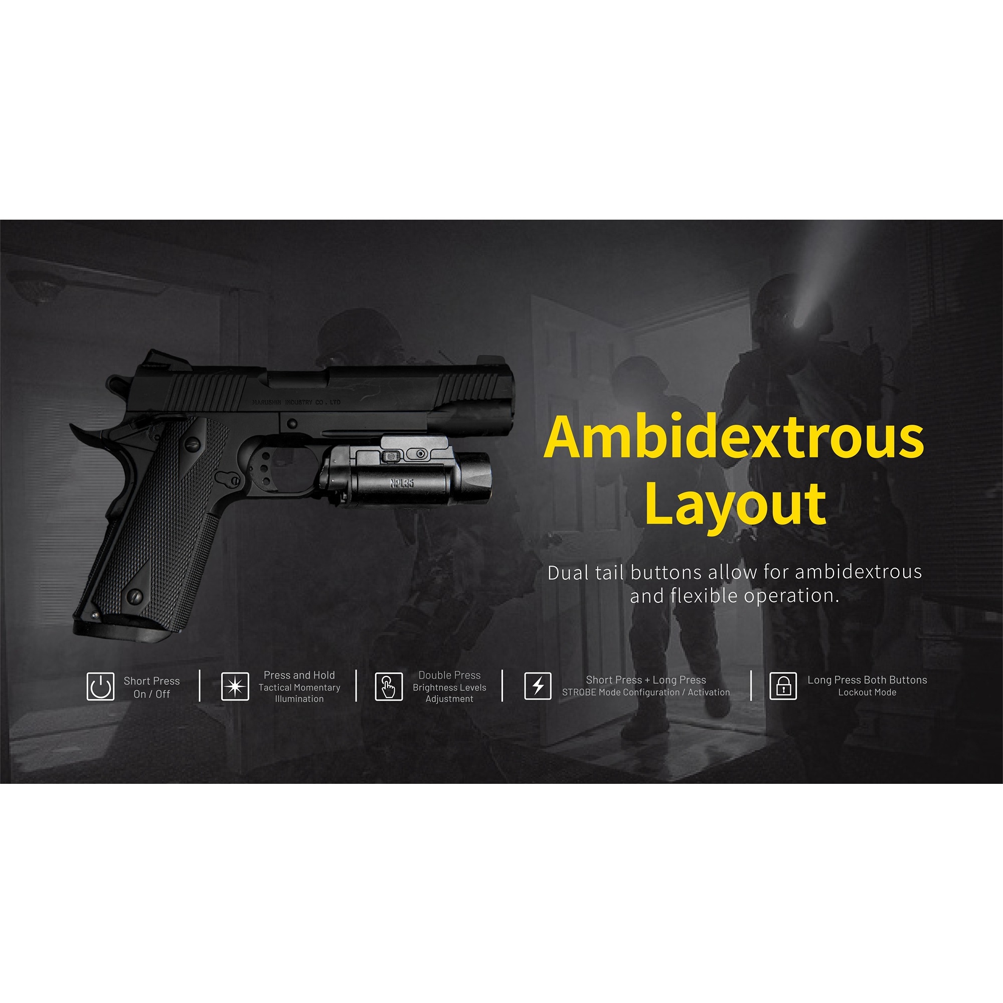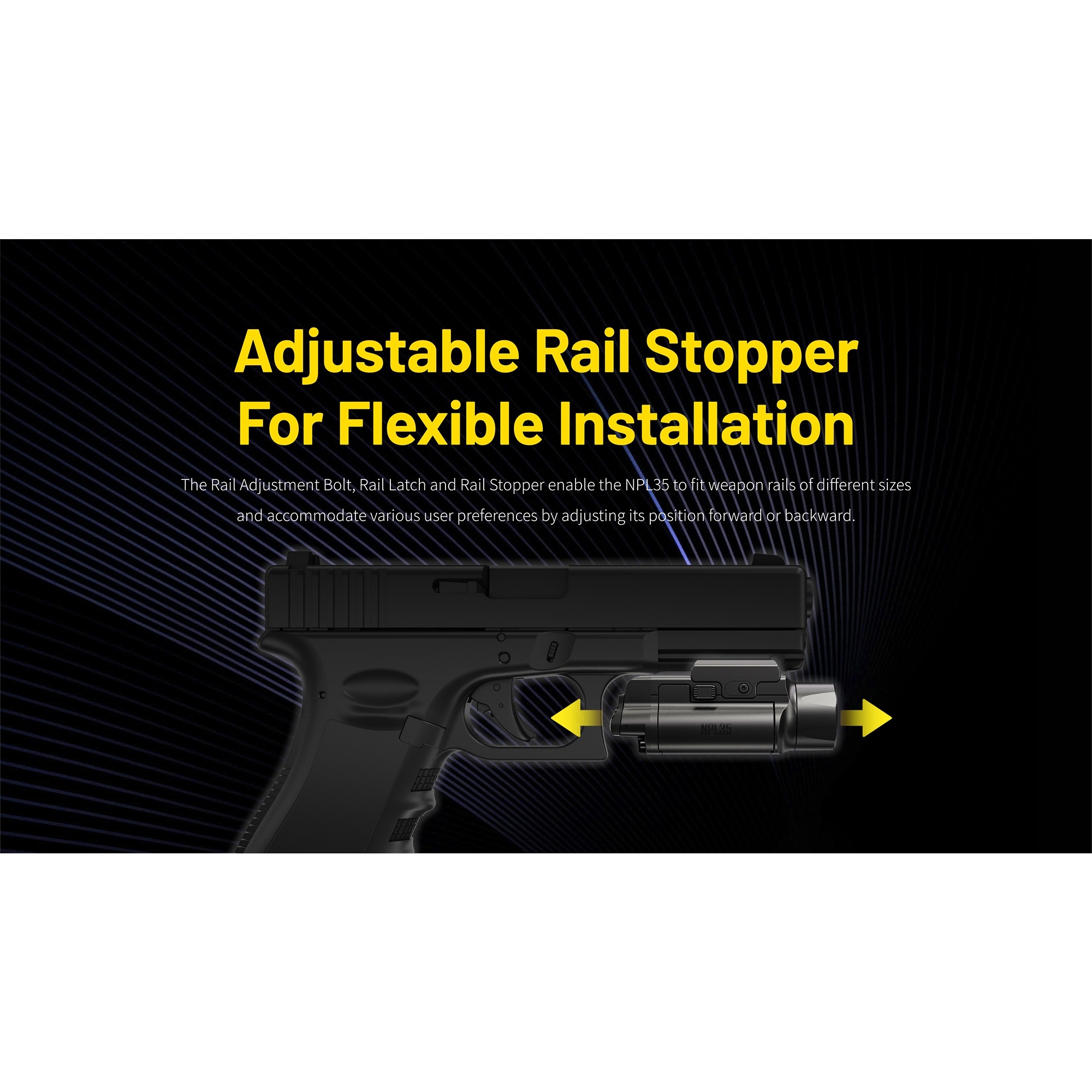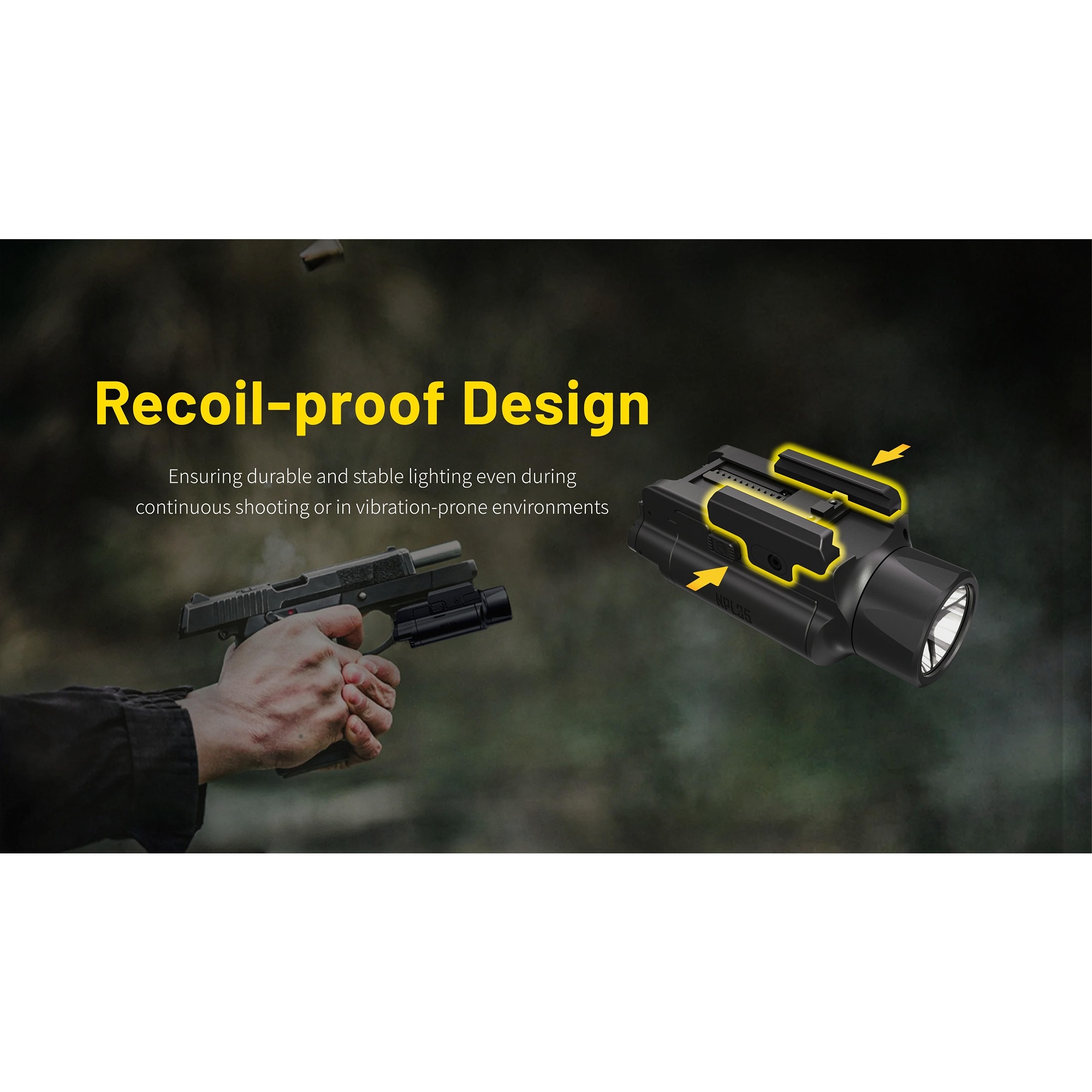 NPL35 er bygget i et lavt og strømlinjeformet design, slik at den sitter tett og diskret på våpenet. Betjeningen er plassert bak og er enkel å nå fra begge sider, noe som gjør lykten rask og intuitiv å bruke. Lykten kan monteres direkte på Glock-skinner og kan via den medfølgende Picatinny-adapteren også brukes på Picatinny-skinner. Det gir en fleksibel løsning som passer til flere ulike plattformer.