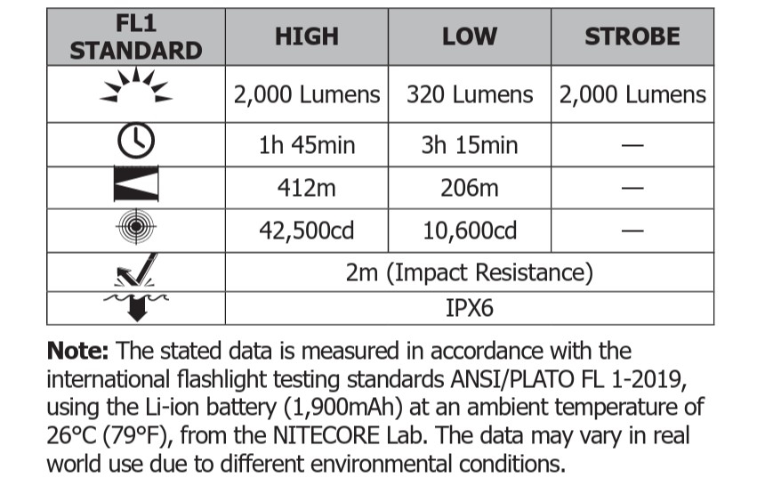 Driftstid ved høyeste lysstyrke (Hvit/2000 lumen) : 1 time og 45 min