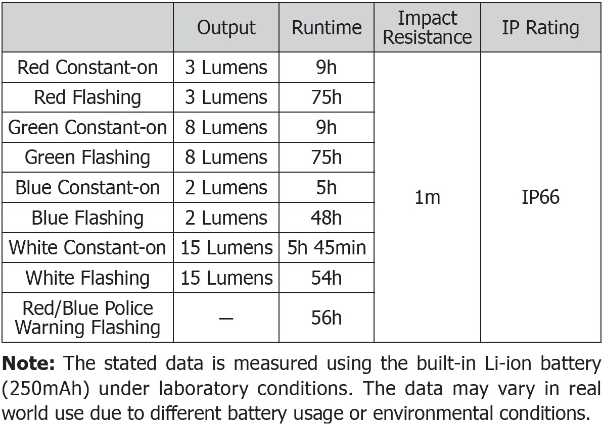 Driftstid ved laveste lysstyrke (rød/3 lumen/konstant lys): 9 timer