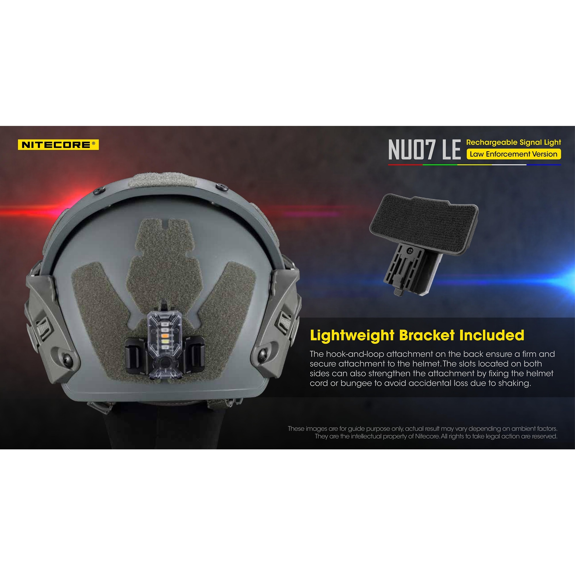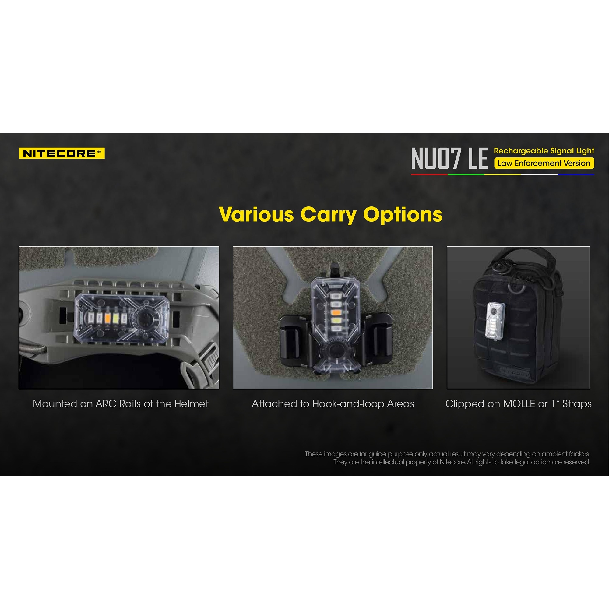 Nitecore NU07 LE er designet med mulighet for fleksible monteringsmuligheter. Lykten er kompatibel med ARC rail og har på baksiden en integrert klips, som gjør det raskt og enkelt å feste lykten direkte på MOLLE-system, stropper, lommekanter eller ryggsekker. I tillegg følger det med et buet velcro-hjelmfeste, som gjør det lett å montere lykten på hjelmen.