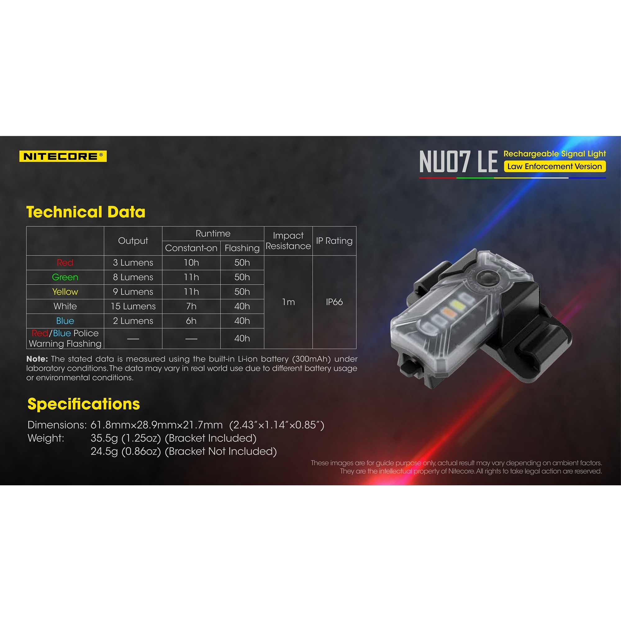 Nitecore NU07 LE er en multifunksjonell signallykt designet for profesjonell bruk, der tydelig identifikasjon og høy synlighet er avgjørende. Den er utstyrt med fem LED-farger – rød, grønn, blå, gul og hvit – noe som gir stor fleksibilitet i både taktiske og sivile situasjoner. Det gjør den spesielt godt egnet for politi, beredskap, security, outdoor og arbeid i mørke omgivelser, der visuell kommunikasjon er viktig.