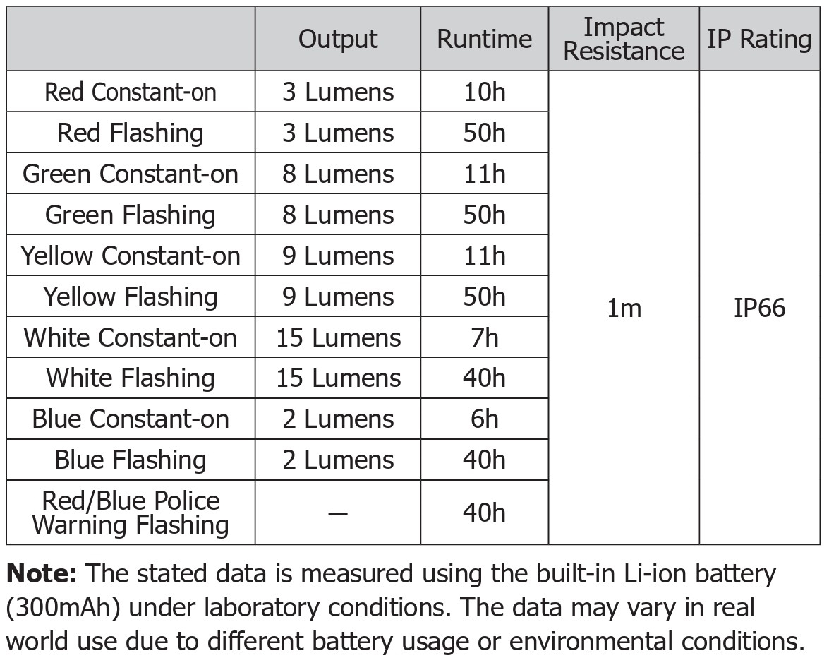 Driftstid ved laveste lysstyrke (Rød/3 lumen/konstant lys): 10 timer
