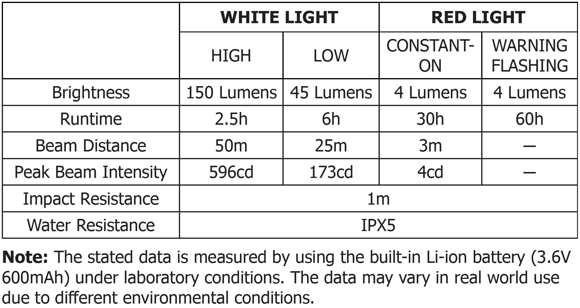 Driftstid ved høyeste lysstyrke (hvit/150 lumen): 2 timer 30 min