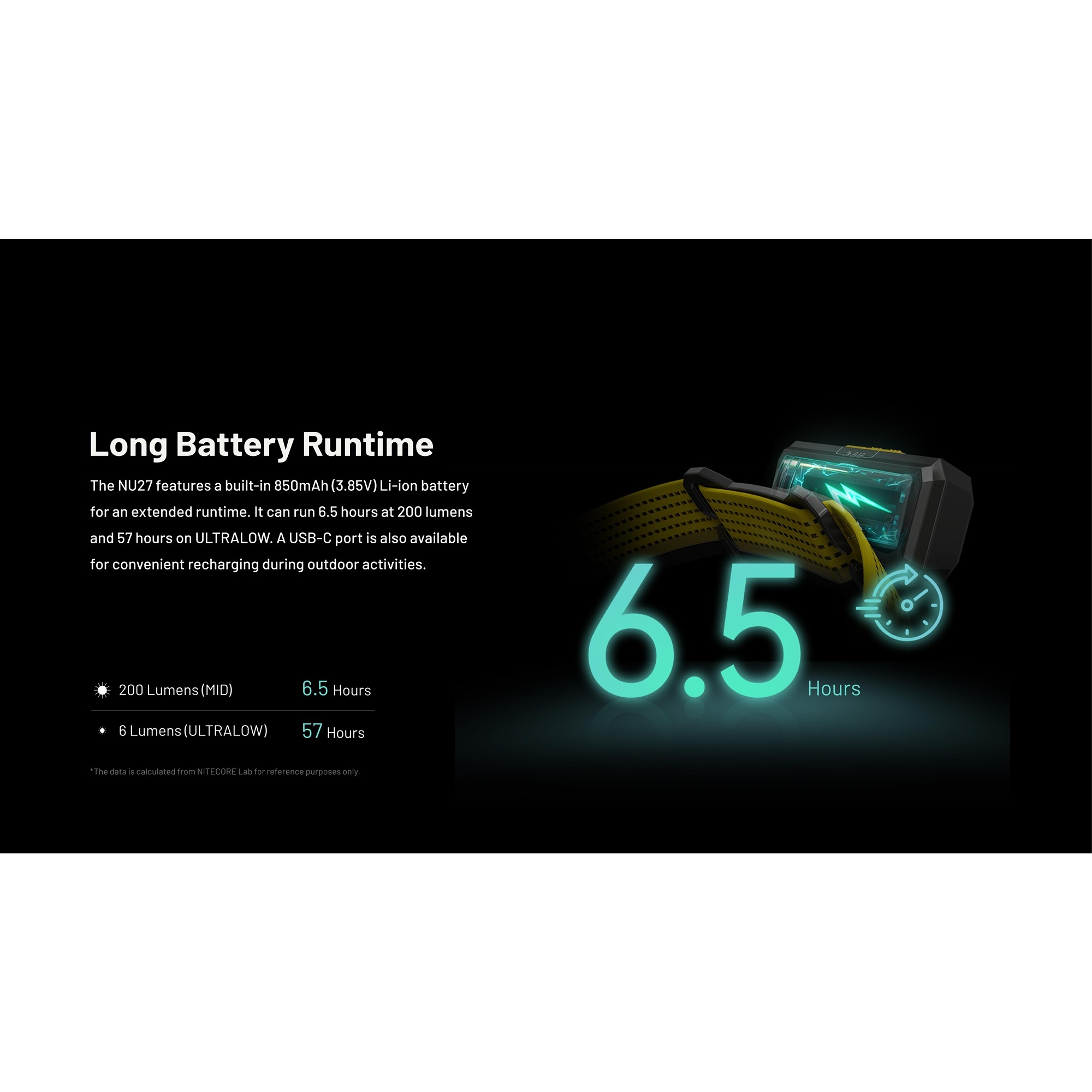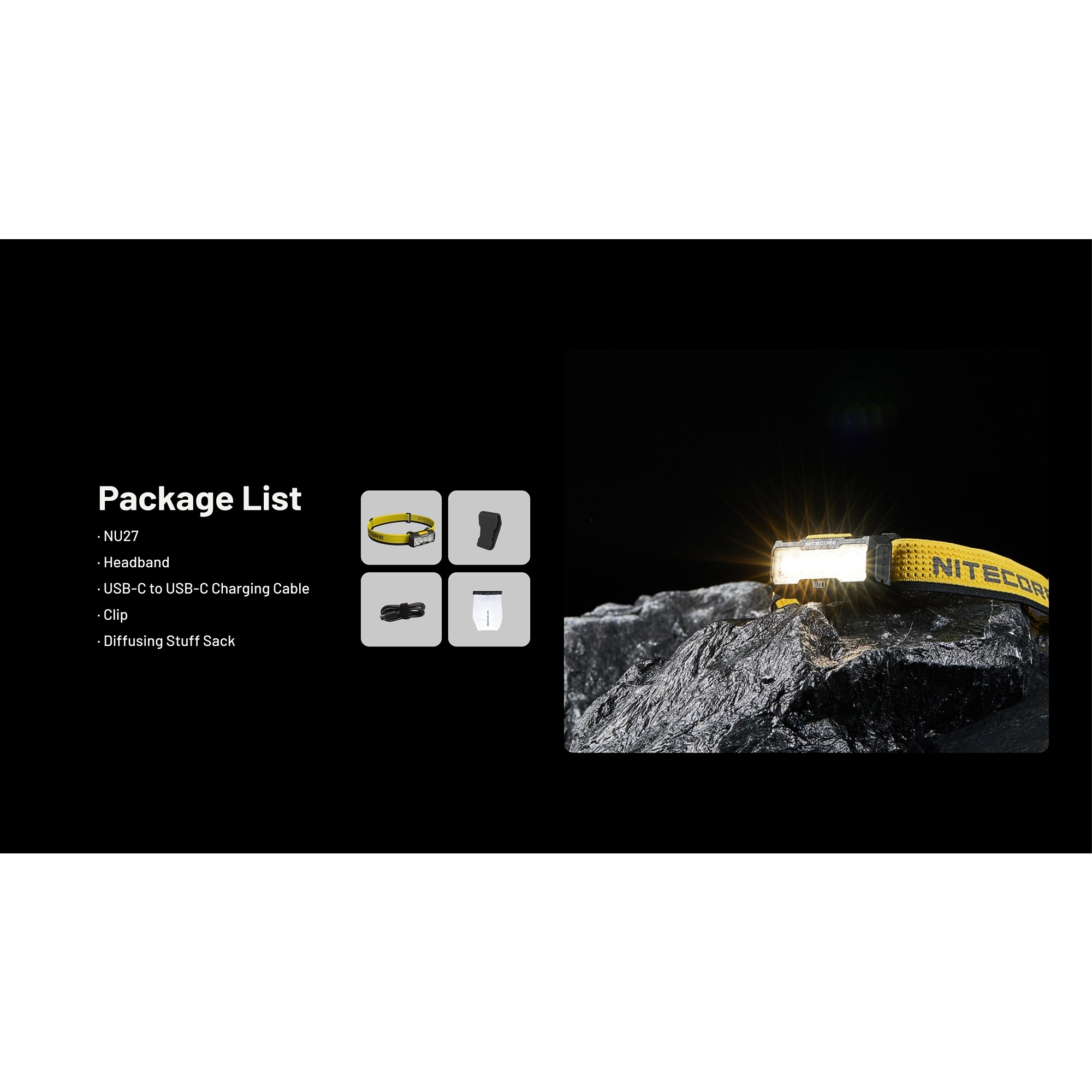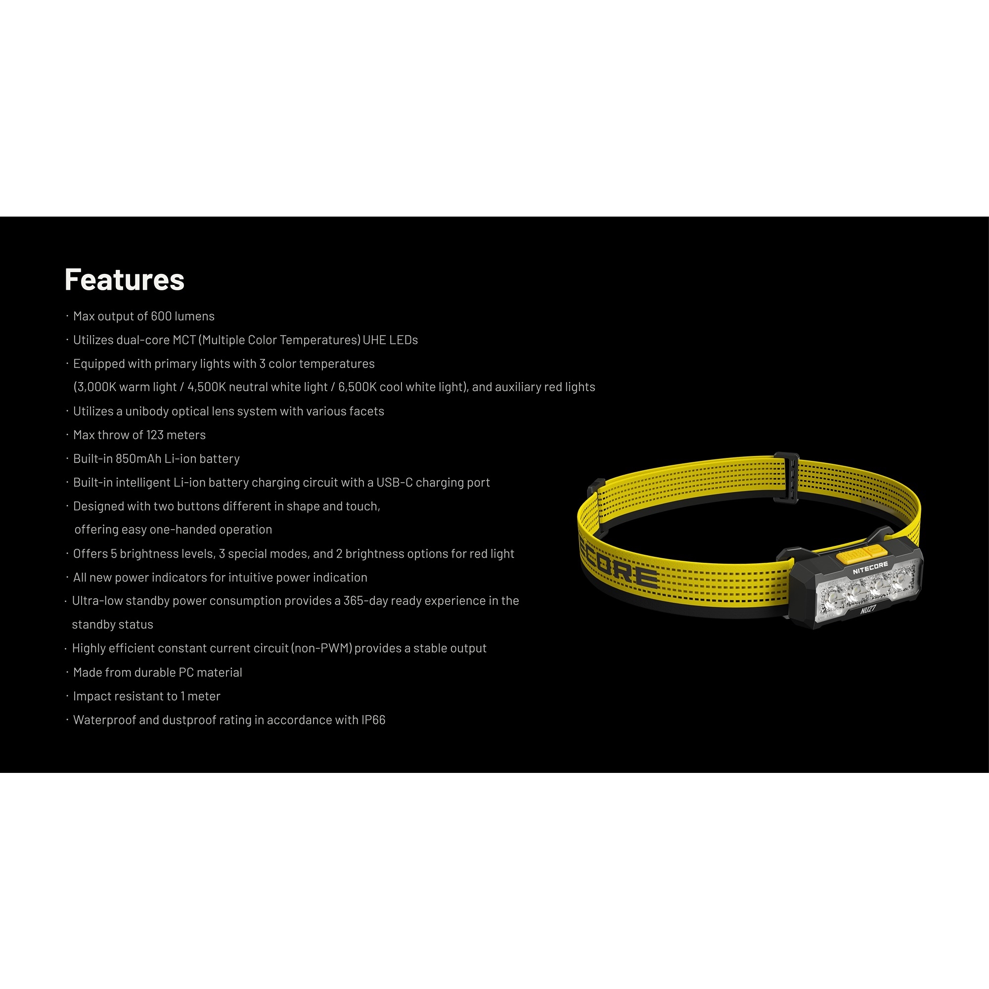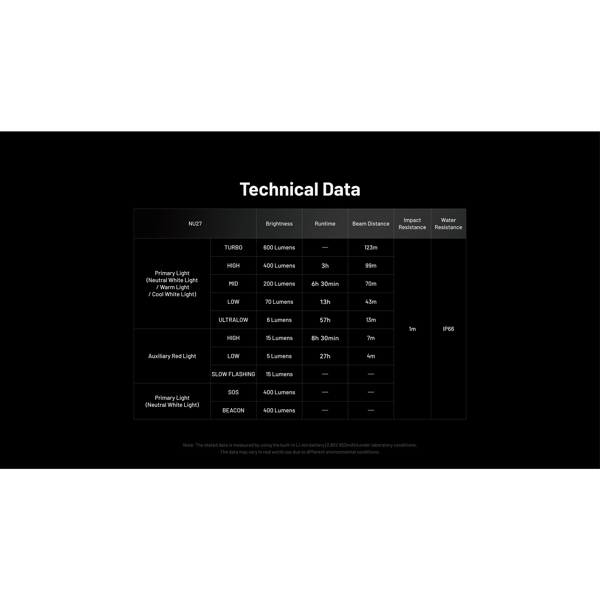 Produkt:  Nitecore NU27 MCT Oppladbar hodelykt 600 lumen, Hvit