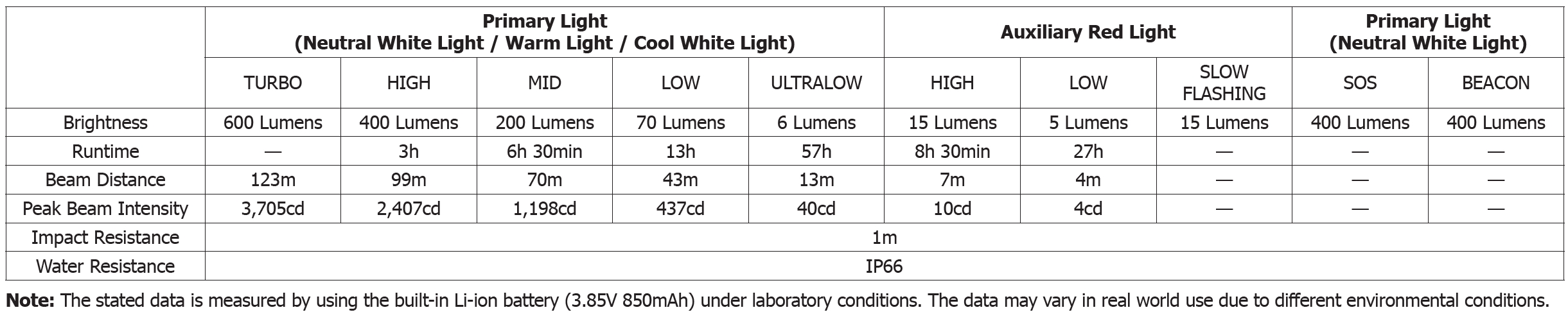 Driftstid ved høyeste lysstyrke (Hvit/400 lumen) : 3 timer