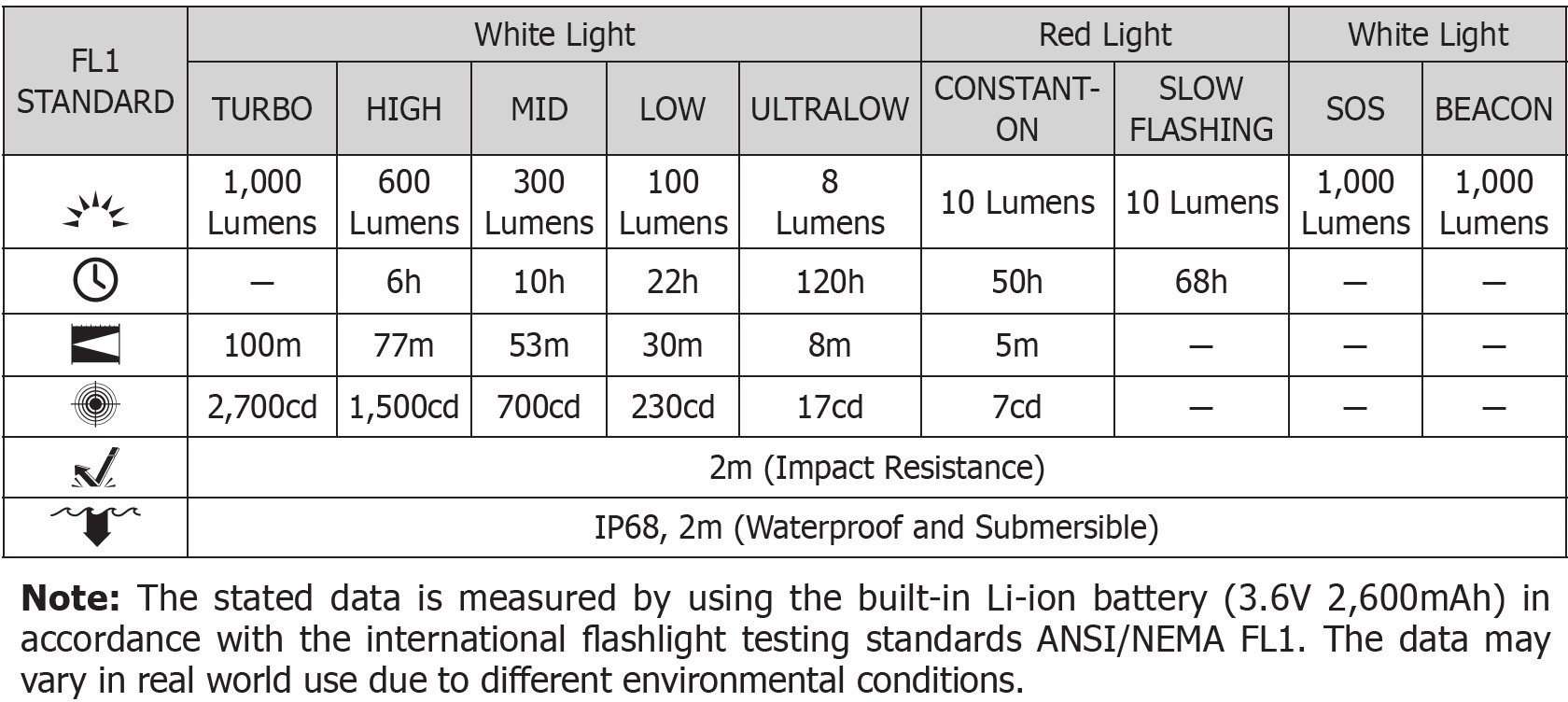Det er mulig å velge mellom 9 ulike lysinnstillinger, inkludert både rødt og hvitt lys samt spesialfunksjoner som SOS og Beacon. Den røde funksjonen bevarer nattsynet og er ideell i leir eller situasjoner der du ikke vil blende andre.