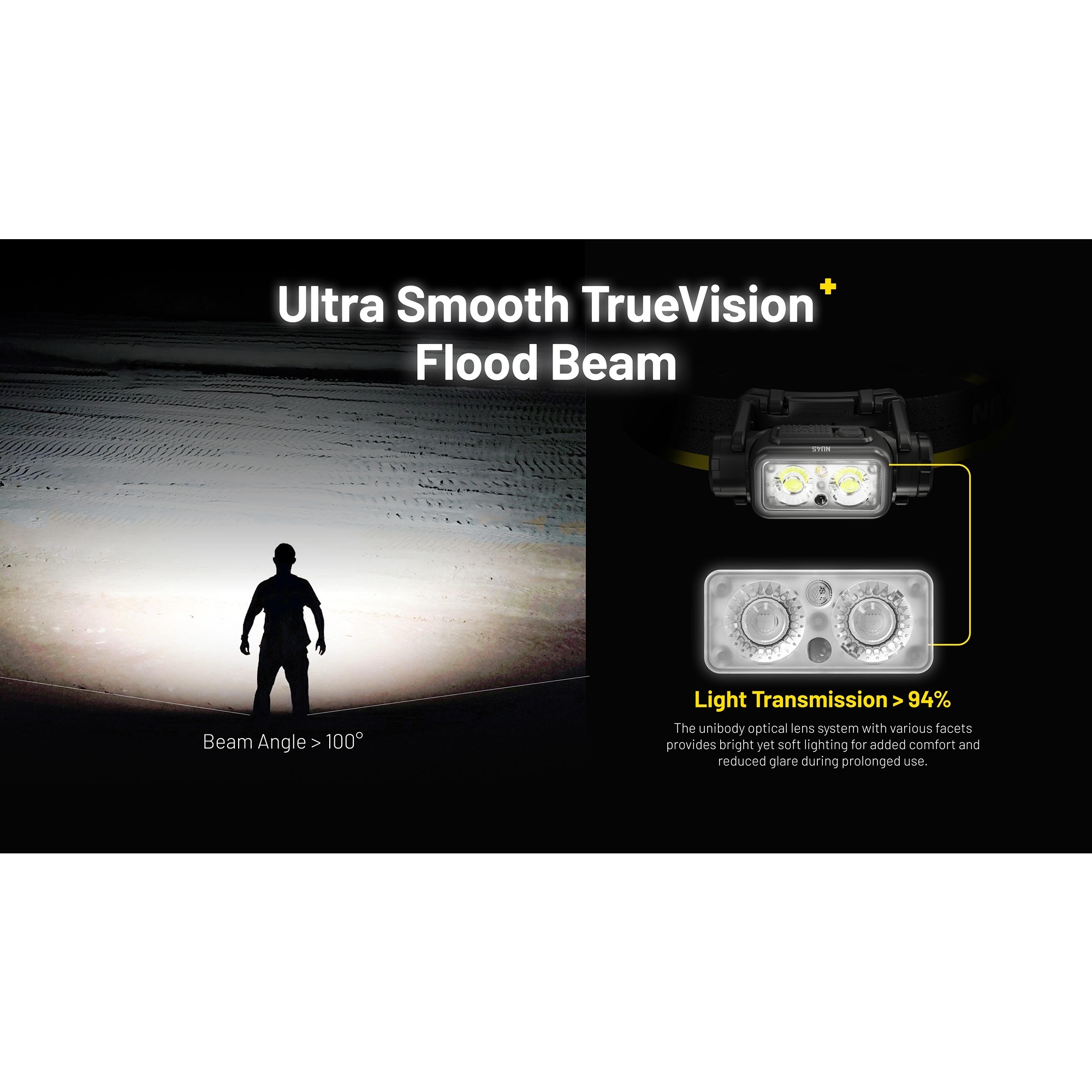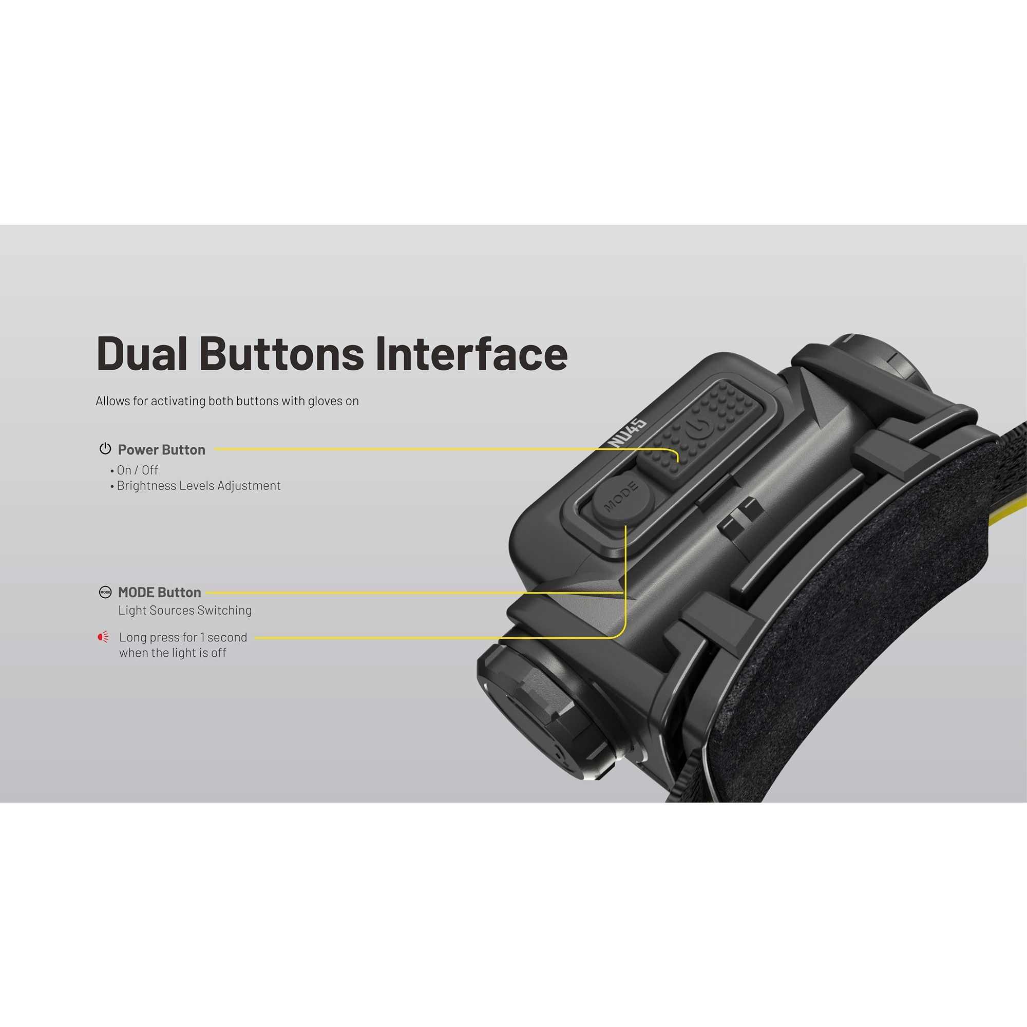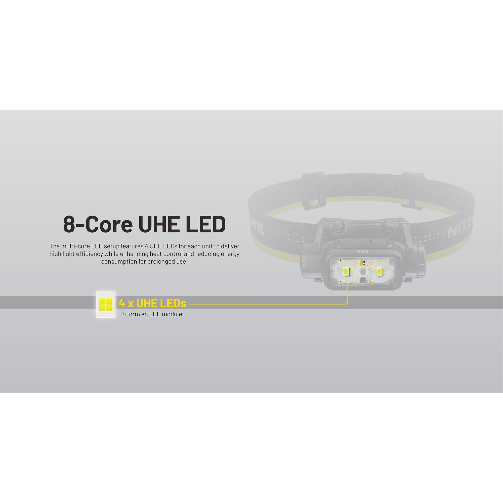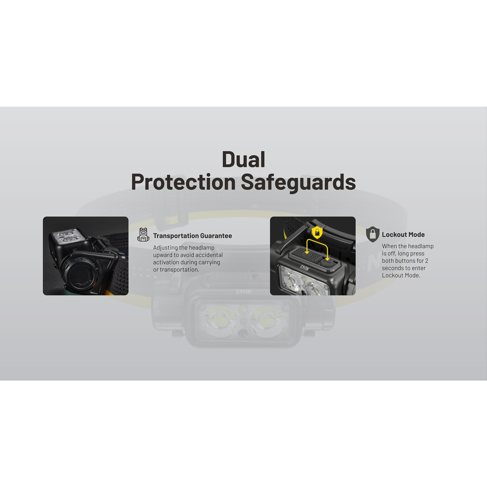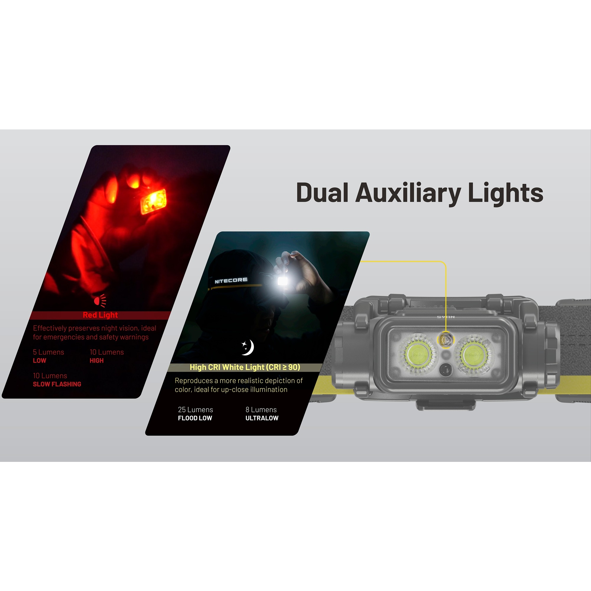 Denne oppladbare hodelykten er utstyrt med 8 NiteLab UHE LED’er og tilbyr både hvitt lys, high CRI-hjelpelys og rødt lys. Det gjør den velegnet både til fart, orientering og mer nært arbeid, der et mykere og mer naturlig lys er en fordel. Nitecore NU45 har dessuten en intelligent sensor protection-funksjon, som automatisk senker lysstyrken hvis den innebygde optiske sensoren registrerer en hindring tett foran lykten. Det bidrar til å redusere risikoen for overoppheting og gjør hodelykten tryggere ved bruk tett på utstyr, bekledning eller i trange omgivelser. Funksjonen kan midlertidig slås av hvis det er behov for det.