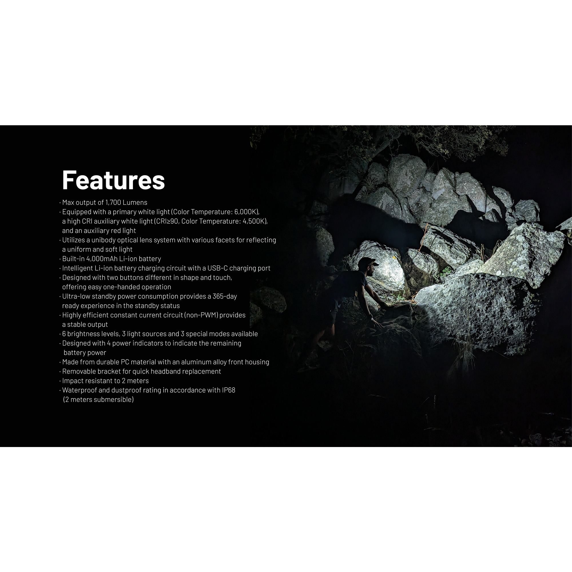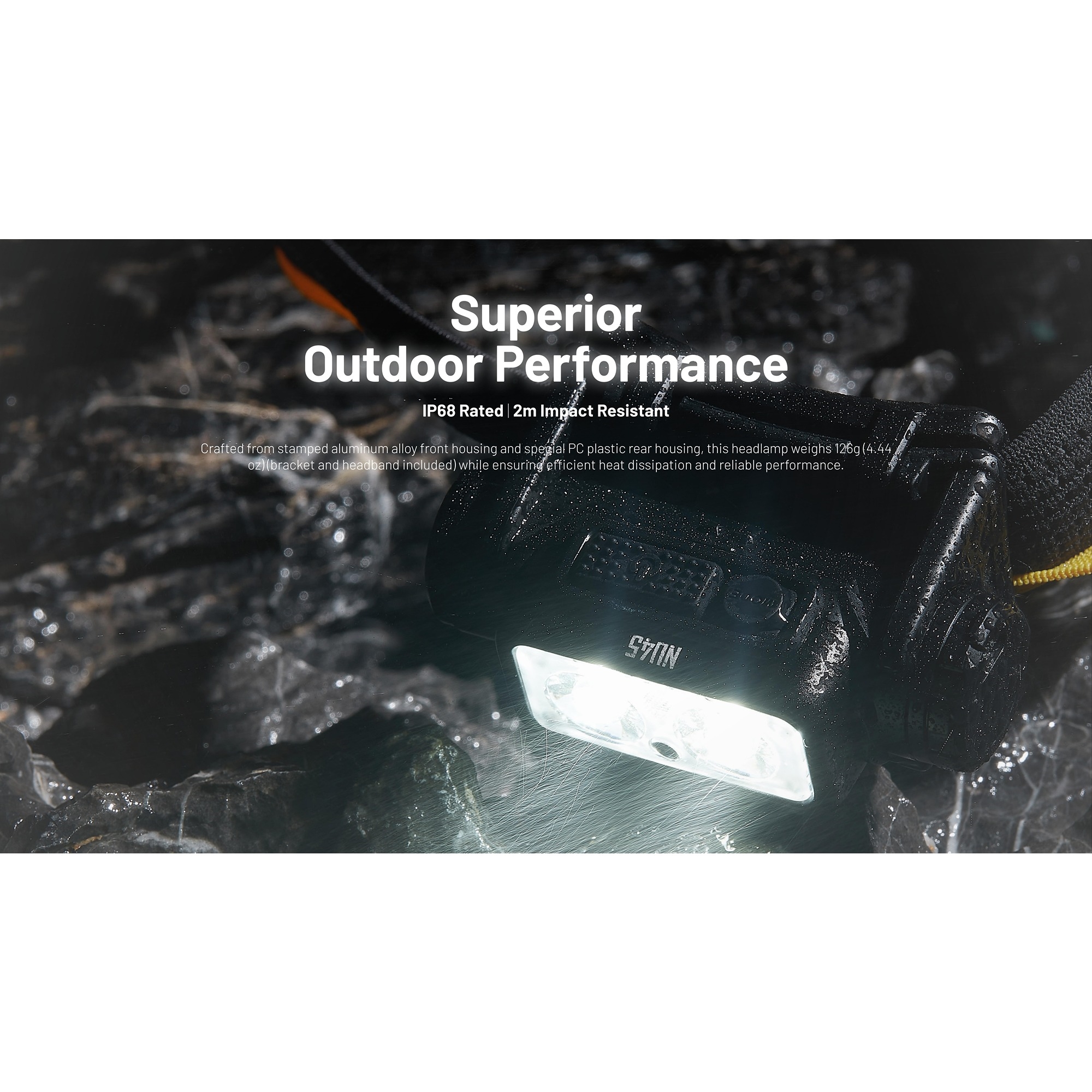 Nitecore NU45 er en kraftig Nitecore hodelykt med opptil 1700 lumen, en rekkevidde på 172 meter og en driftstid på opptil 86 timer, og den er et opplagt valg til nattløping, outdoor, camping og krevende oppgaver der både komfort og ytelse betyr noe. Lykten har innebygd 4.000 mAh Li-ion-batteri, USB-C hurtiglading og IP68-beskyttelse mot vann og støv. Det spesielle med Nitecore NU45 er balansen mellom høy effekt og lav vekt.