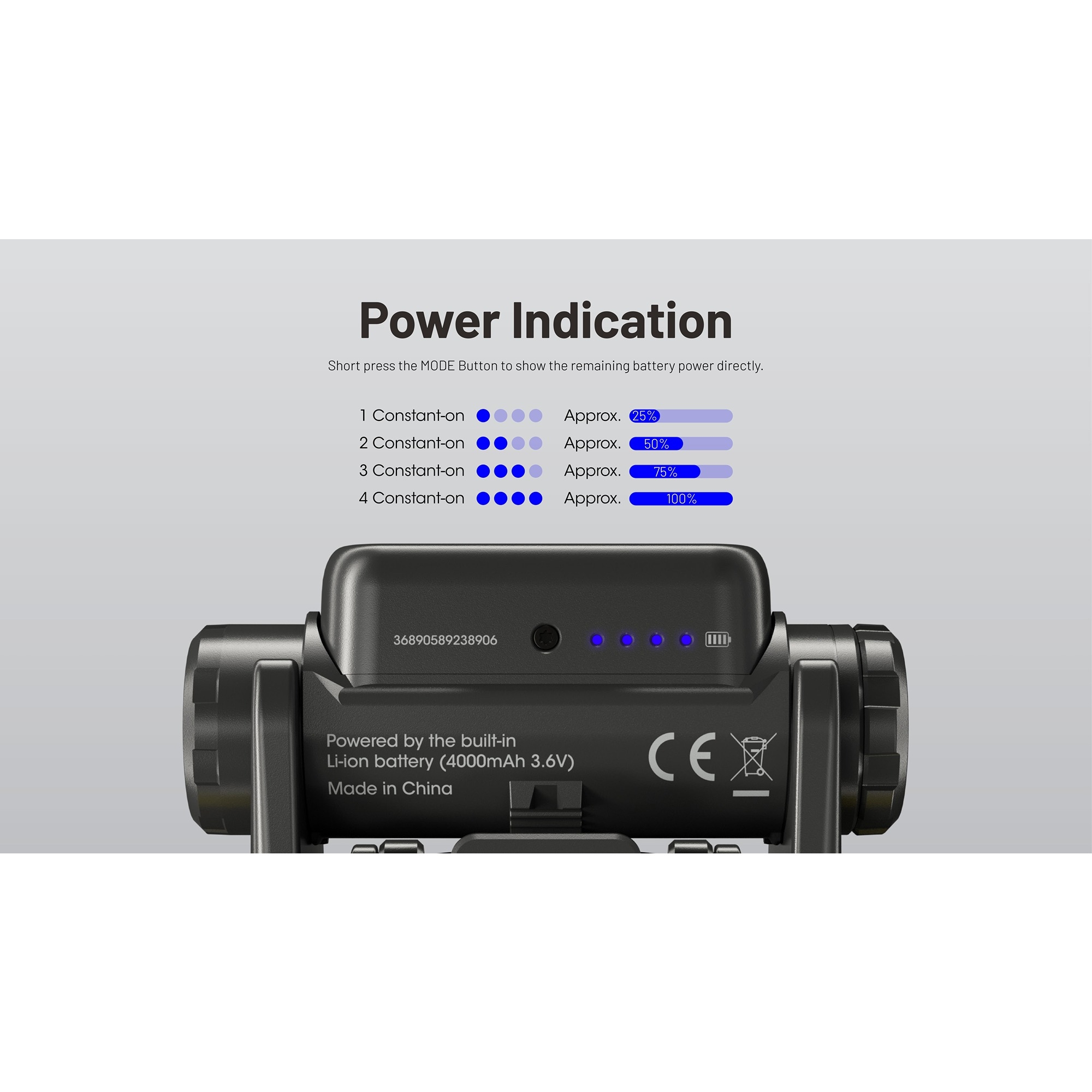 Driftstid ved laveste lysstyrke (Hvit/8 lumen): 86 timer