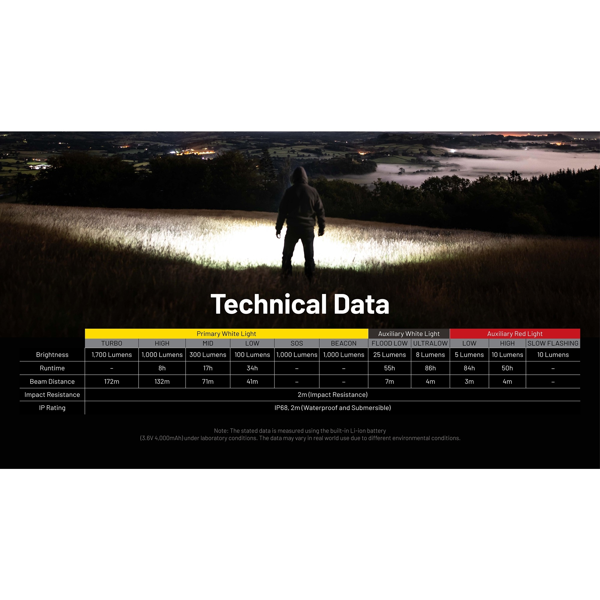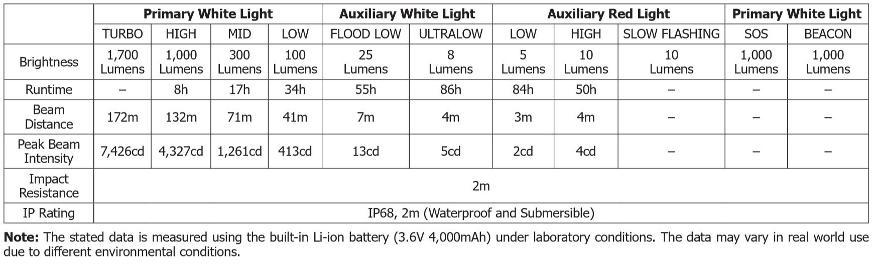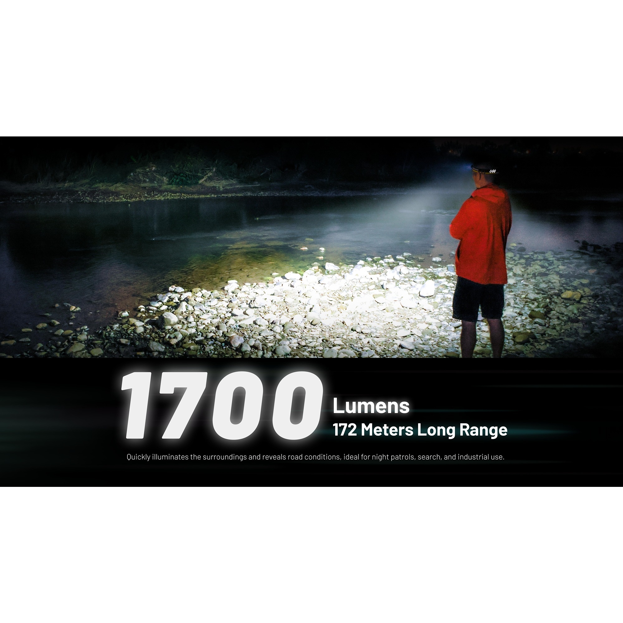 • 1700 lumen og 172 meters rekkevidde gir sterkt lys til både sti, leir og arbeidsområde.