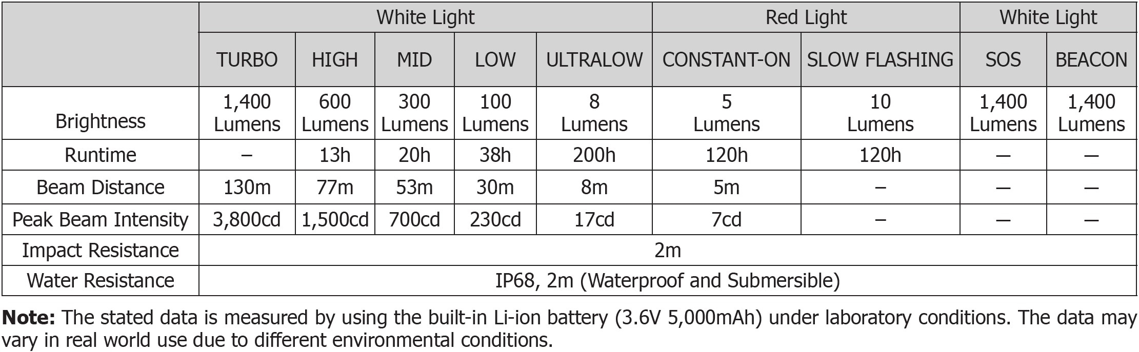 • Opptil 1400 lumen og ca. 130 meters rekkevidde