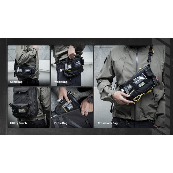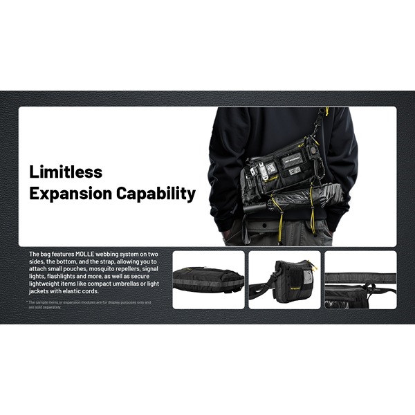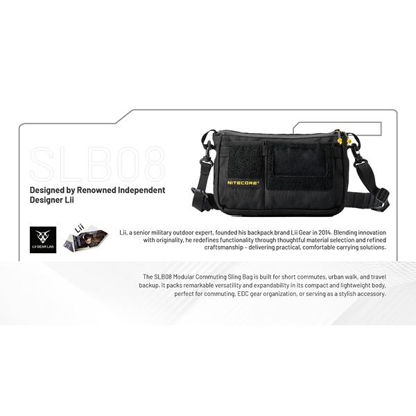 Vesken er designet for MOLLE-systemet. Webbing/nylonstroppene på sidene, i bunnen og på skulderstroppen gjør det mulig å utvide med ekstra lommer eller utstyr. Samtidig kan SLB08 integreres direkte på NITECORE-ryggsekker f.eks. BP23 Pro ryggsekk, noe som gjør den perfekt som modulær tillegg. Laget i slitesterk 500D nylon og med en vekt på ca. 125 g er den både robust og ultralett. Den justerbare skulderstroppen gjør at SLB08 kan bæres som sling bag, crossbody eller belteveske.