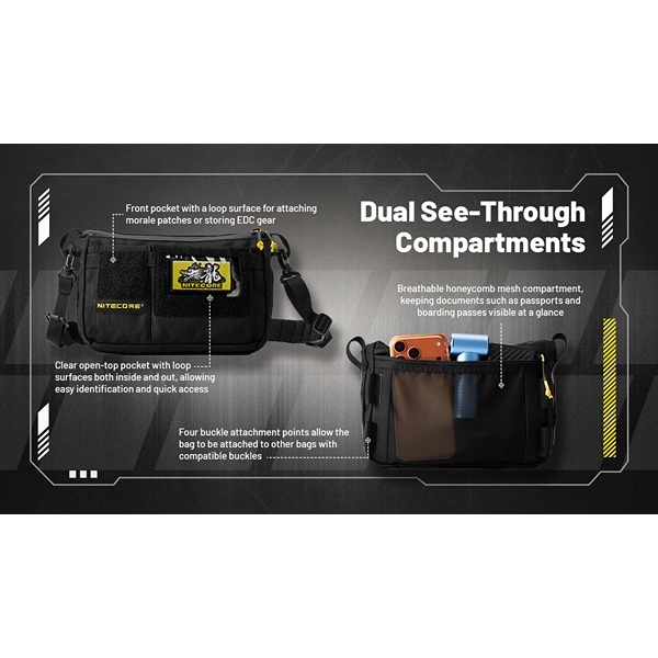 NITECORE SLB08 er en kompakt og gjennomtenkt sling bag for hverdagsbruk, pendling og reiser. Vesken har ett hovedrom i svart, utstyrt med flere mindre innvendige rom på den ene siden, som gir effektiv organisering av EDC-utstyr som mobil, powerbank og tilbehør. Utvendig har SLB08 en gjennomsiktig frontlomme samt et mesh-rom på baksiden, ideelt for ting du raskt vil kunne få tilgang til.
