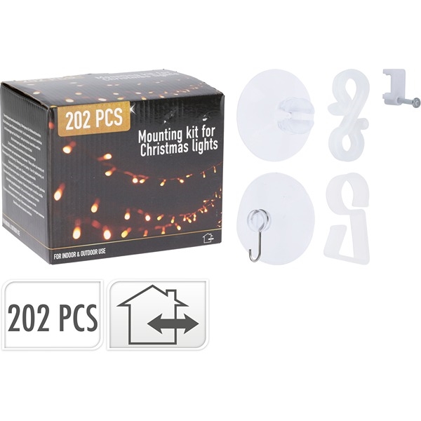 Gjør det raskt og enkelt å sette opp lysstrengene dine med dette hendige monteringssettet! Med 202 deler, inkludert sugekopper, kroker og klips, kan du enkelt feste julelysene både innendørs og utendørs til vinduer, takrenner og takskjegg. Perfekt for julebelysning, dekorative lys og utendørs stemningsbelysning.