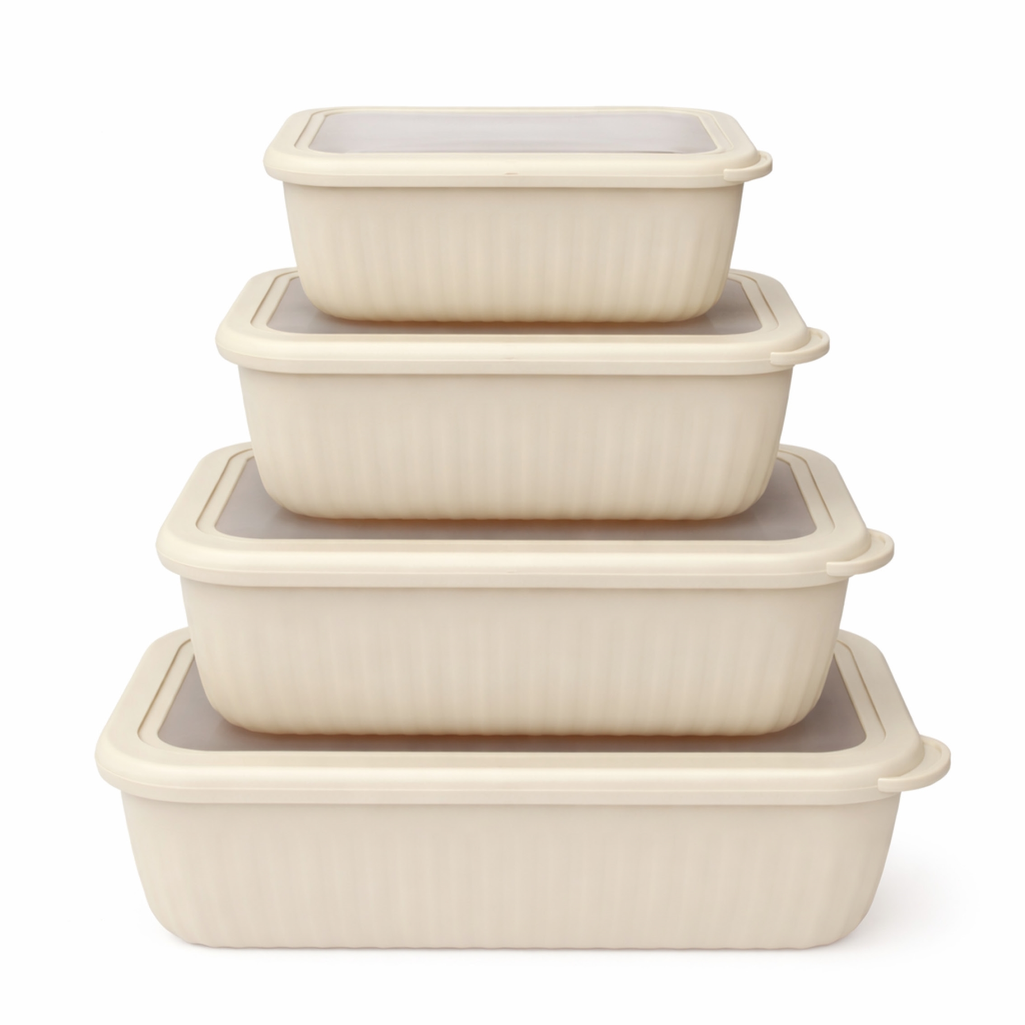 Beige stablebart skålsett med lokk – 4 rektangulære plastskåler med lokk