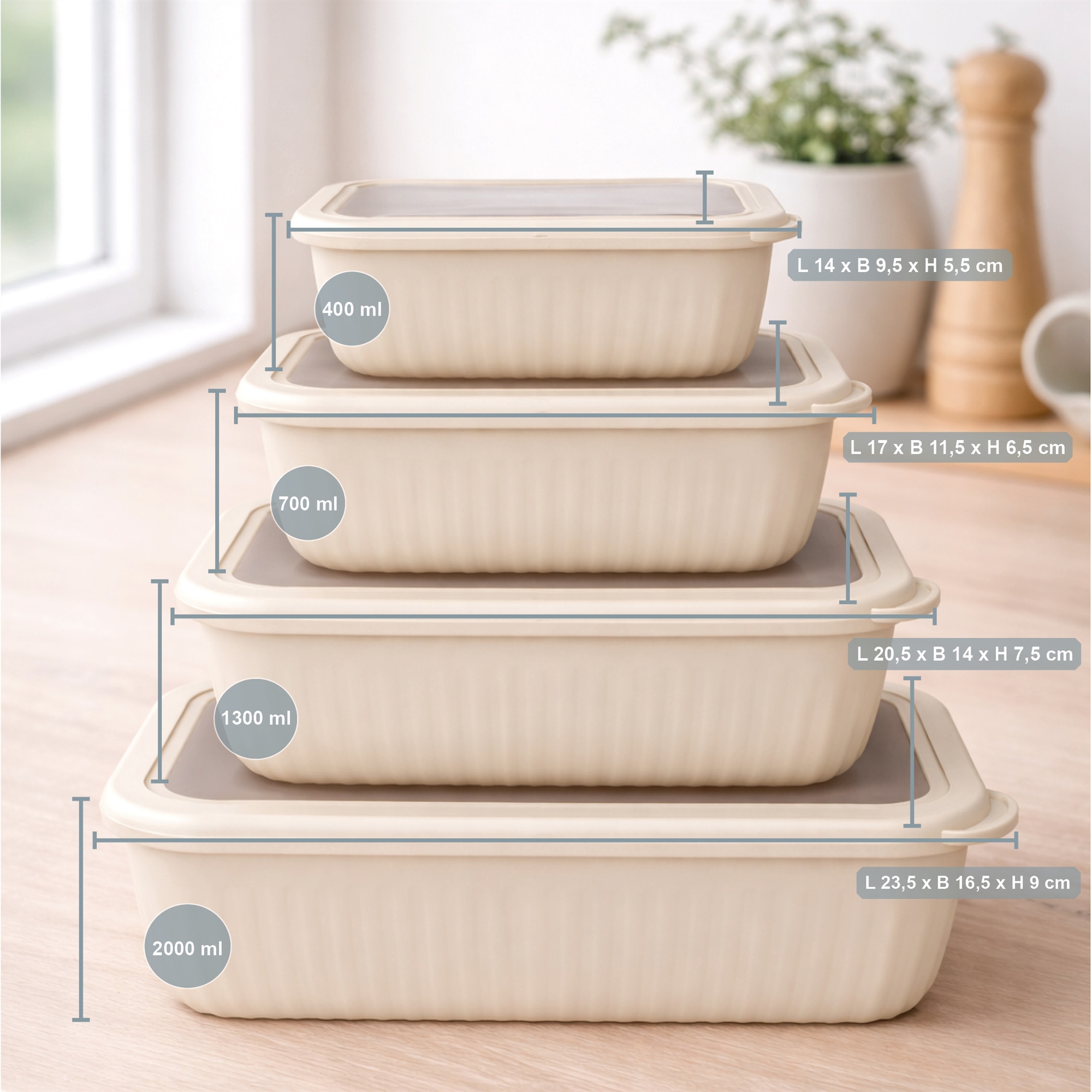 Dette elegante beige skålsettet i rektangulær form er både praktisk og har et flott design. Settet består av 4 plastskåler med tettsittende og transparent lokk i størrelsene 400, 700, 1300 og 2200 ml – ideelle til både servering på middagsbordet og smart oppbevaring av matvarer, snacks og hobbyartikler.