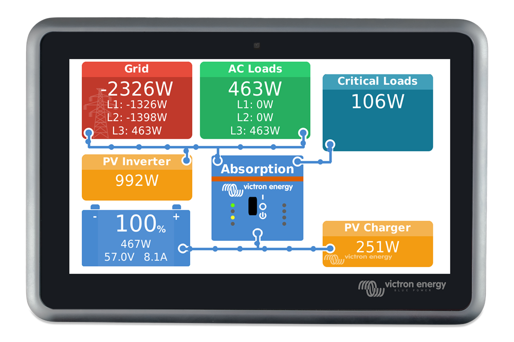 Victron Ekrano GX er en 7-tommers berøringsskjerm designet for å fungere som et brukergrensesnitt og ekstern overvåkingsenhet for Victron Energy sine produkter og systemer.
